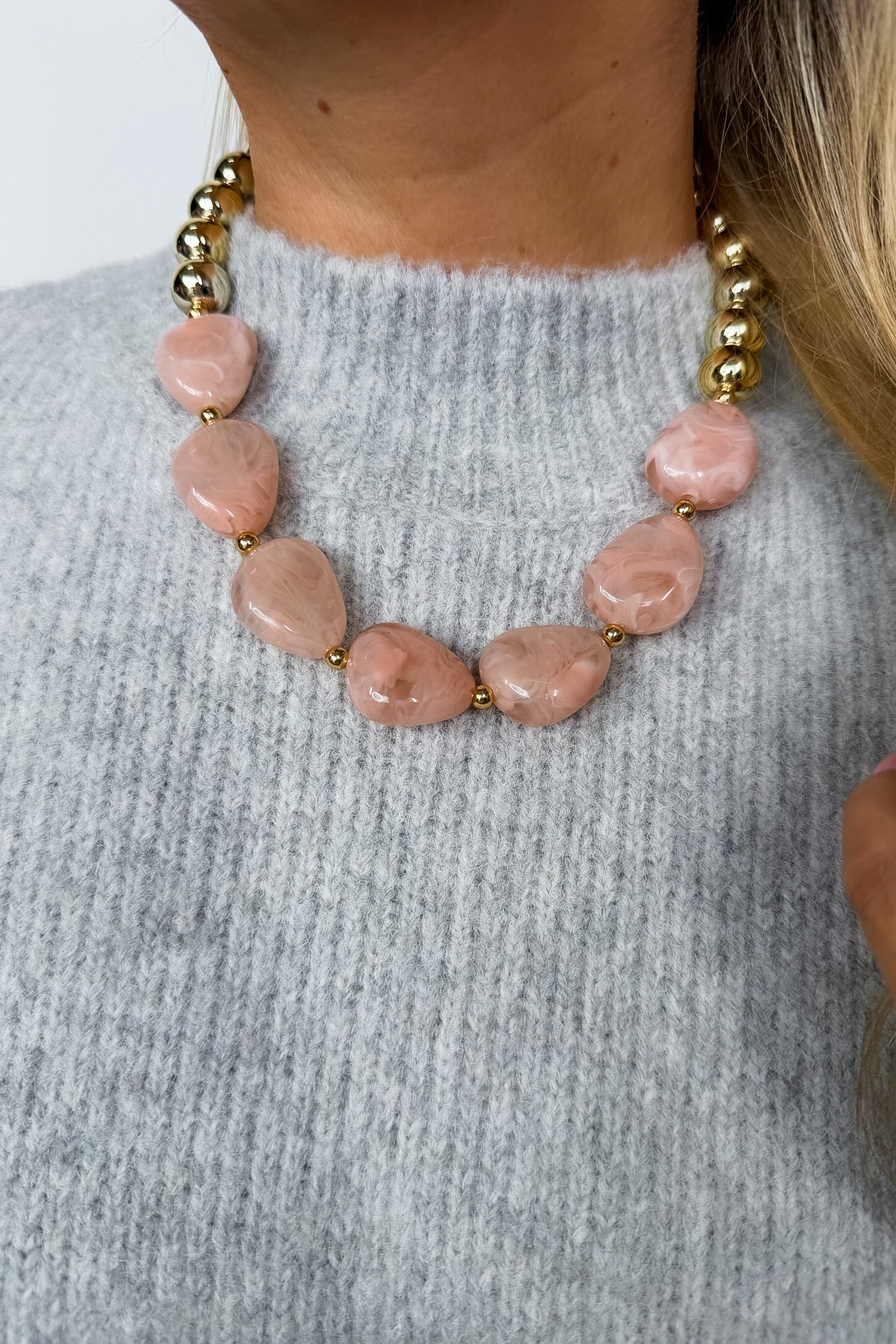 Soft, feminine, and effortlessly elegant — this necklace features dreamy blush-toned marbled stones paired with high-shine gold beads for the perfect balance of warmth and sophistication. Designed to elevate everything from everyday knits to special occasion looks, it’s a timeless statement you’ll reach for again and again.