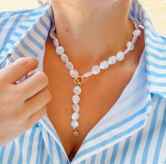 Meet your new polished-but-effortless statement piece. With lustrous, organic-shaped pearls hand-strung into a chic toggle-front lariat silhouette. The elongated drop is ultra-flattering and adds that perfect touch of glam to button-downs, dresses, and holiday looks. Whether you’re styling it for brunch or layering it for a night out, this necklace instantly elevates every outfit.