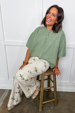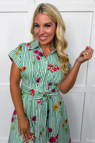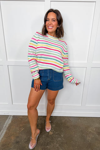 Preppy Girl Dress With Cardigan Draped Across The Shoulders in Navy Stripes