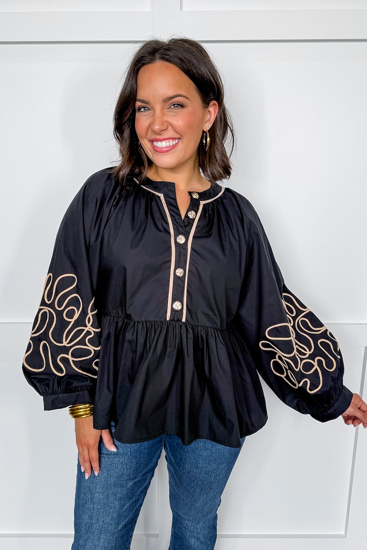 She Means Business Black Peplum Top with Tan Embroidered Details