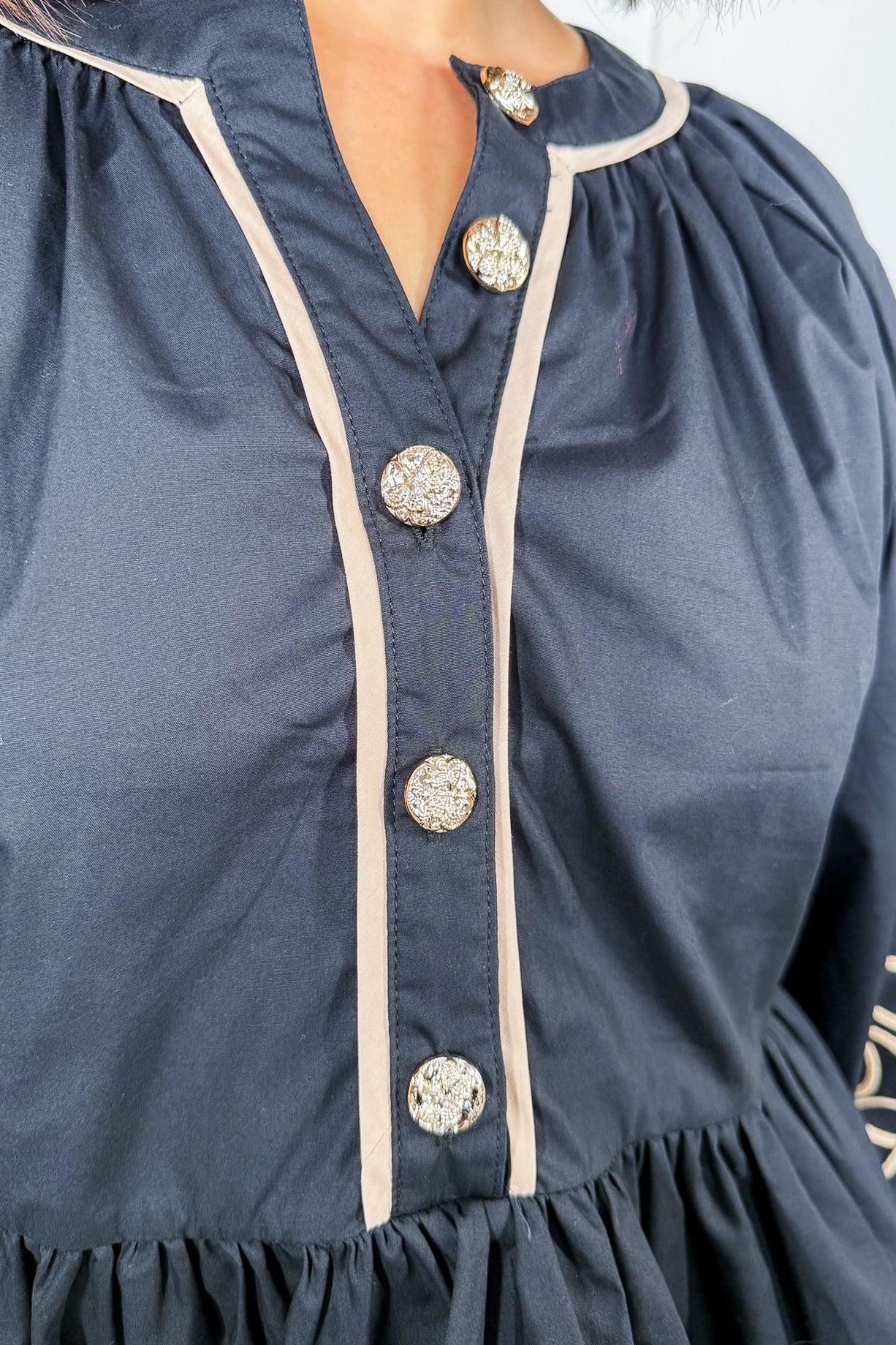 Elevated meets effortlessly chic. This black top features a flattering peplum-inspired silhouette, gold piping along the neckline, and ornate gold embroidery trailing down the sleeves. Dressy enough for date nights and holiday events, yet easy enough to pair with denim — it’s the perfect statement blouse for any wardrobe.