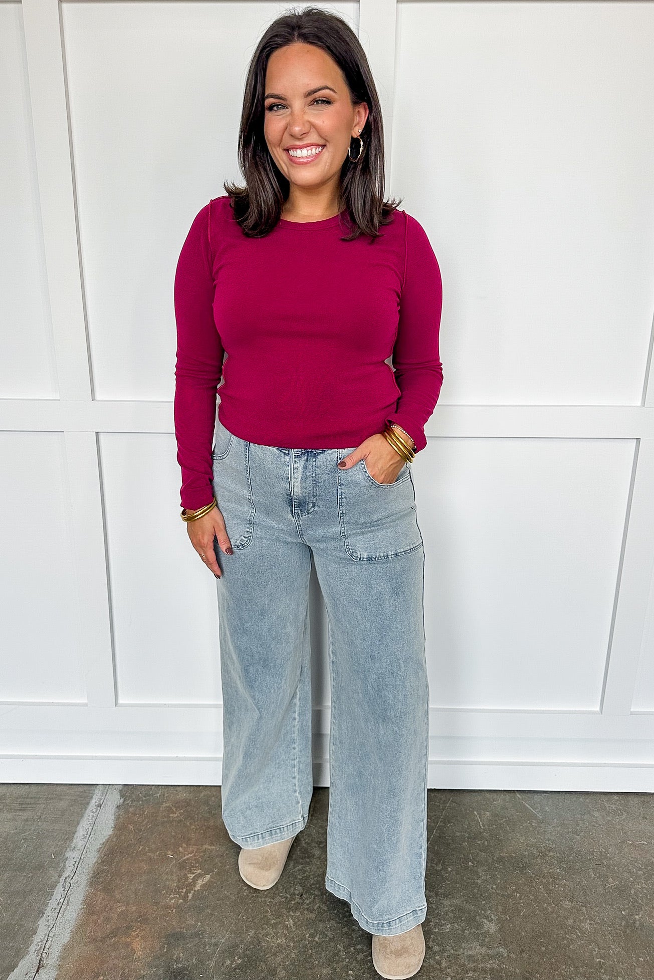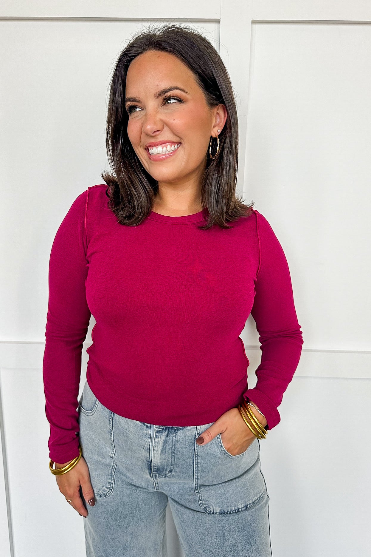 Add a splash of fun to your layering game with this Everyday Basic Layering Long Sleeve Top in Wine. Its cozy knit fabric and classic crew neck make it perfect for stacking up warmth while keeping your style fresh. Whether worn solo or under your favorite jackets, this long sleeve tee will quickly become your go-to. And if wine isn’t your hue, don’t worry—it’s also available in a lively green!