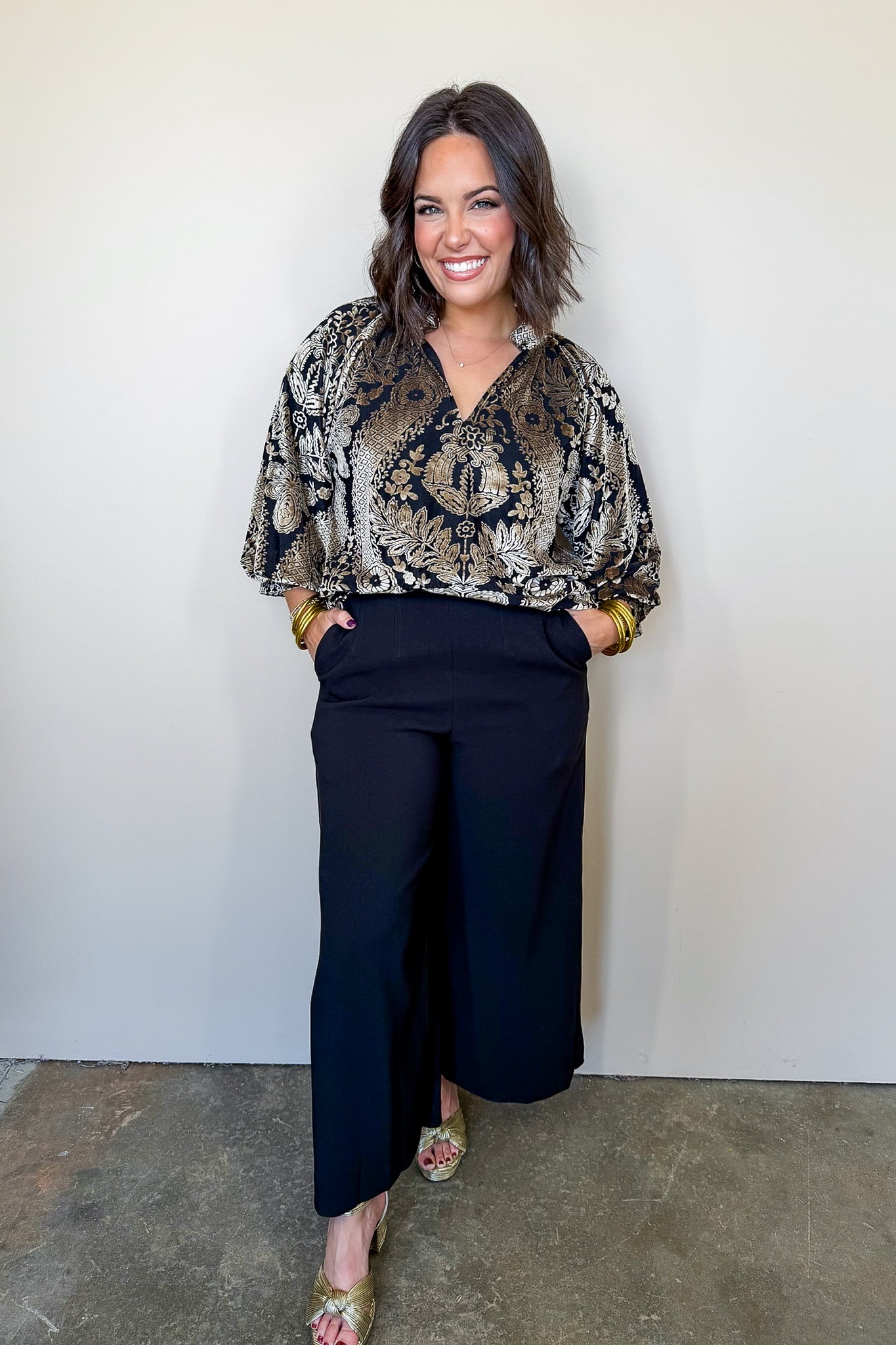 Elevate your wardrobe with the Golden Tapestry Blouse, a striking statement piece crafted with intricate metallic embroidery on a rich black base. Featuring voluminous 3/4 sleeves, a chic V-neckline  and a relaxed silhouette.
