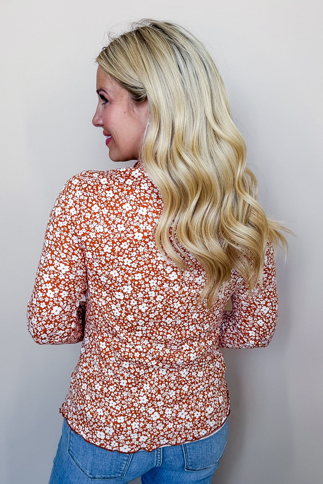 Add a touch of charm with this rust colored long sleeve top featuring and all over floral. Designed with a soft, stretchy fabric and a comfortable form fitting it. - Perfect for pairing with jeans or layering!