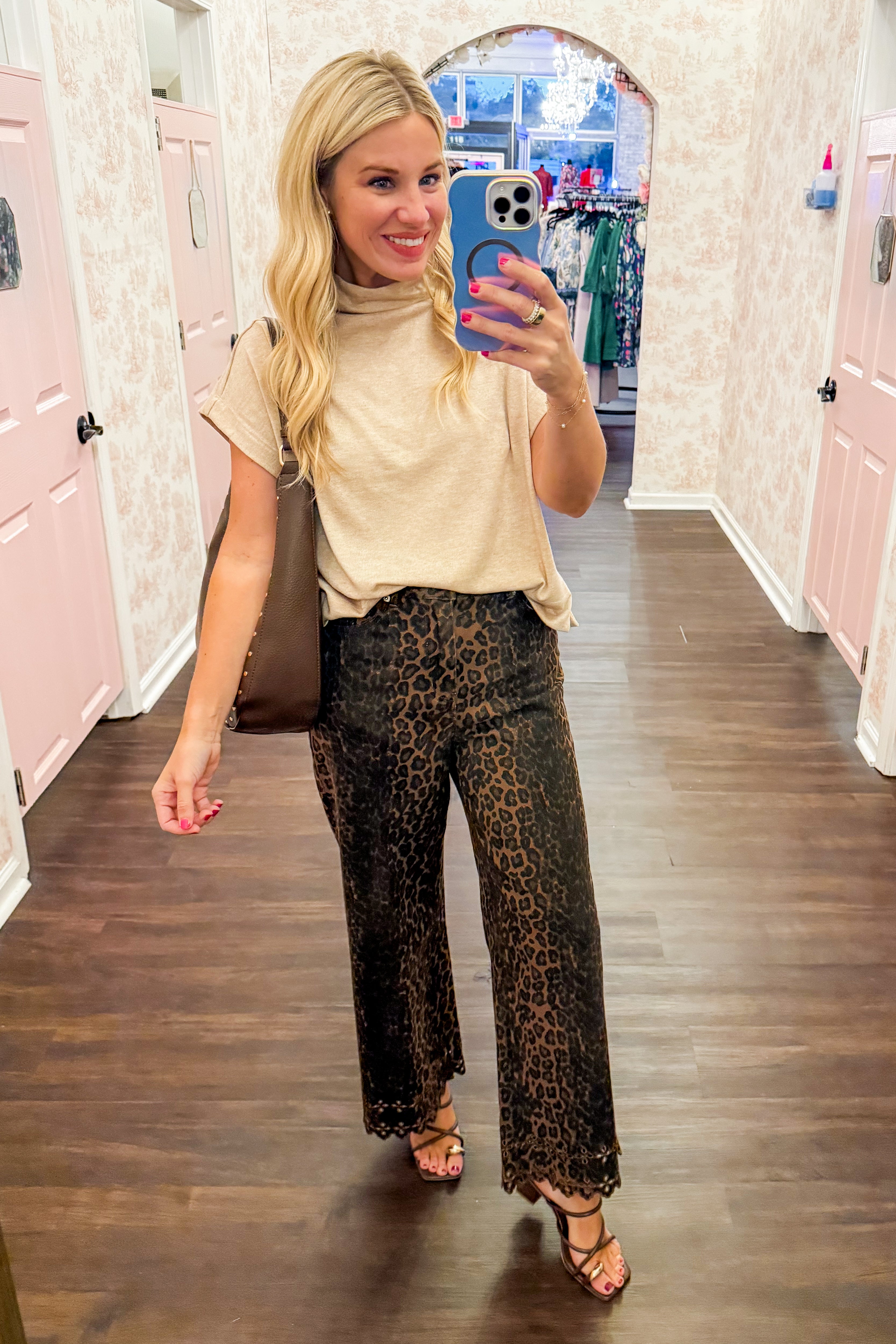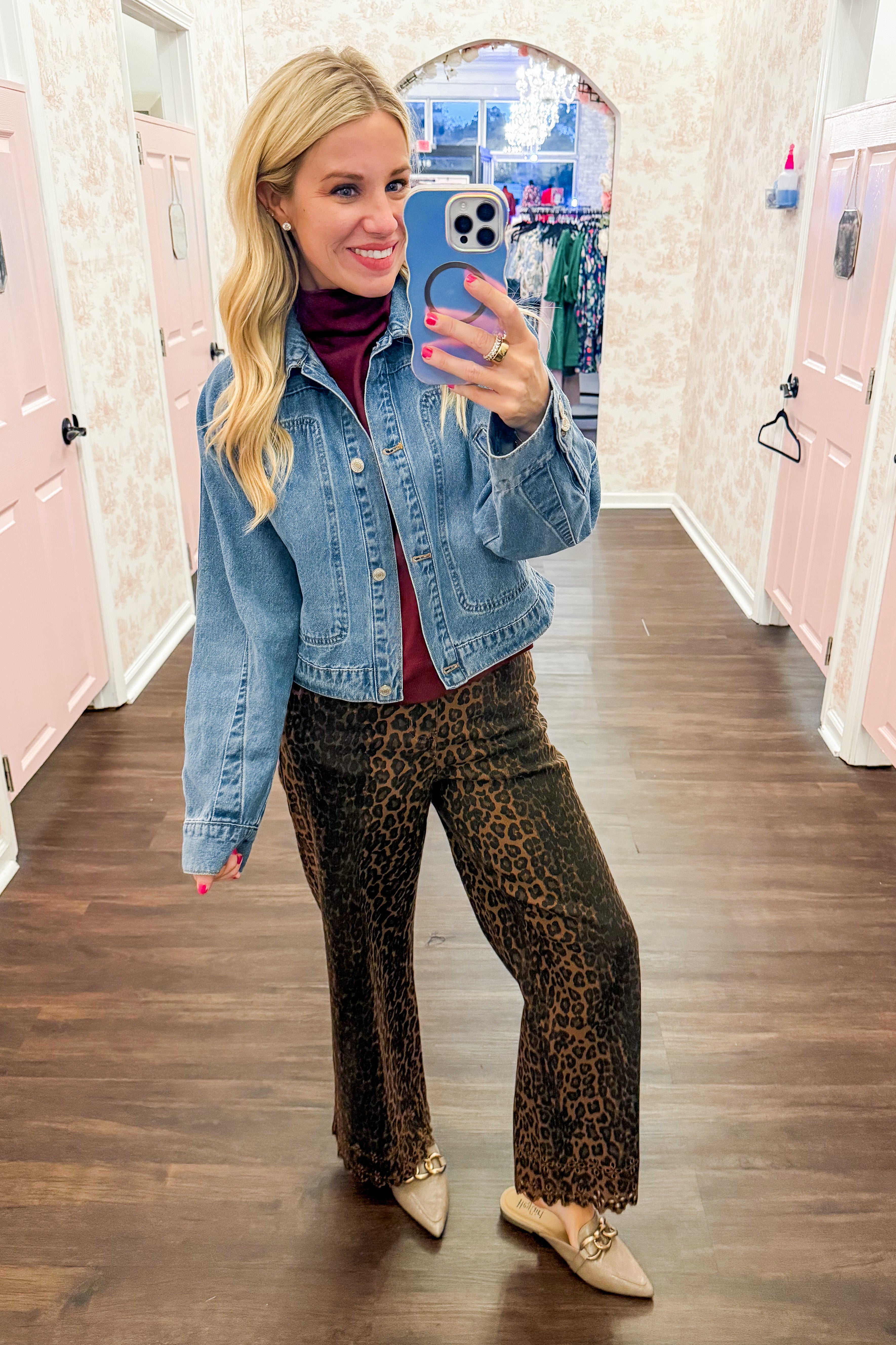 Step out with fierce confidence in the Wild Edge Leopard Print Scalloped Pant. These high-waisted beauties feature playful scalloped hems that add a flirty twist to your look. With handy pockets upfront and in back, style meets function effortlessly. Perfect for turning heads on any occasion!