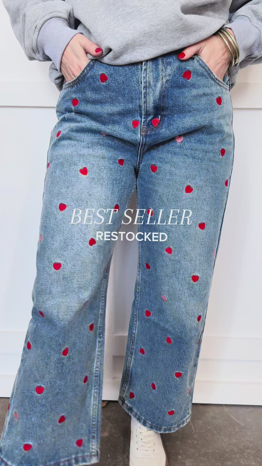 Meet your new statement denim! These wide-leg jeans feature adorable embroidered hearts throughout for the perfect mix of playful + trendy. With a relaxed leg, classic denim wash, and flattering high-rise fit, these jeans instantly elevate your everyday style. Pair with a simple tee or an oversized sweater for the cutest casual look!