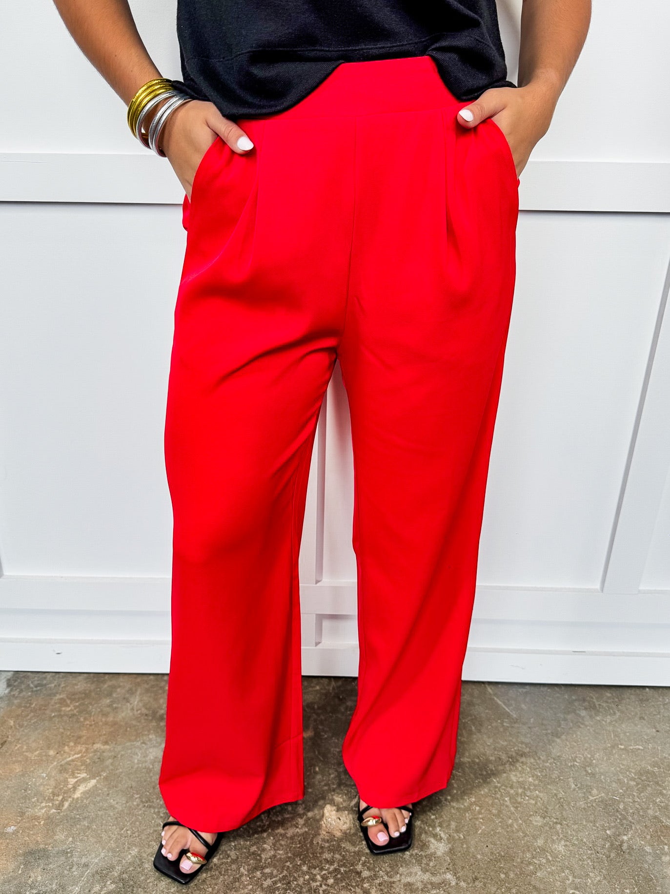 Turn every hallway into a runway in these stunning red wide-leg trousers. Designed with a bold, confidence-boosting silhouette, they feature a relaxed drape that moves effortlessly with you. Whether you dress them up with heels or keep it casual with sneakers, these pants add instant polish and personality to any outfit.
