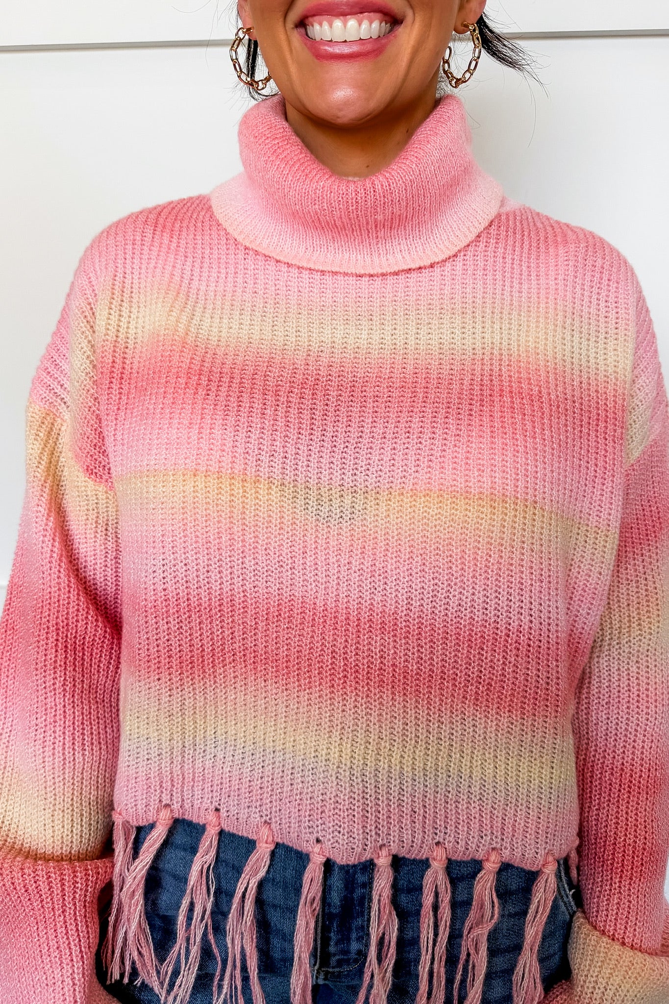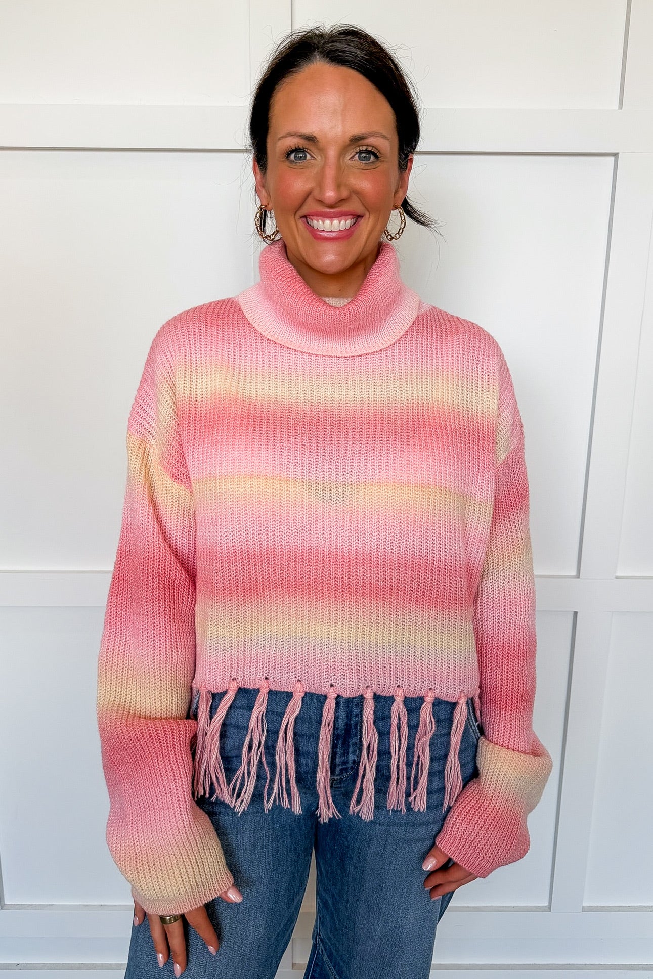 Soft pastel peach meets playful fringe detailing in this cozy turtle neck sweater. The gentle hue brings warmth and sophistication to any seasonal wardrobe, while the fringed trim adds a touch of movement and personality. Perfect for layering or wearing solo, this piece transitions effortlessly from casual days to relaxed evenings. The high neckline provides comfort and coverage, making it an ideal choice for cooler weather styling.