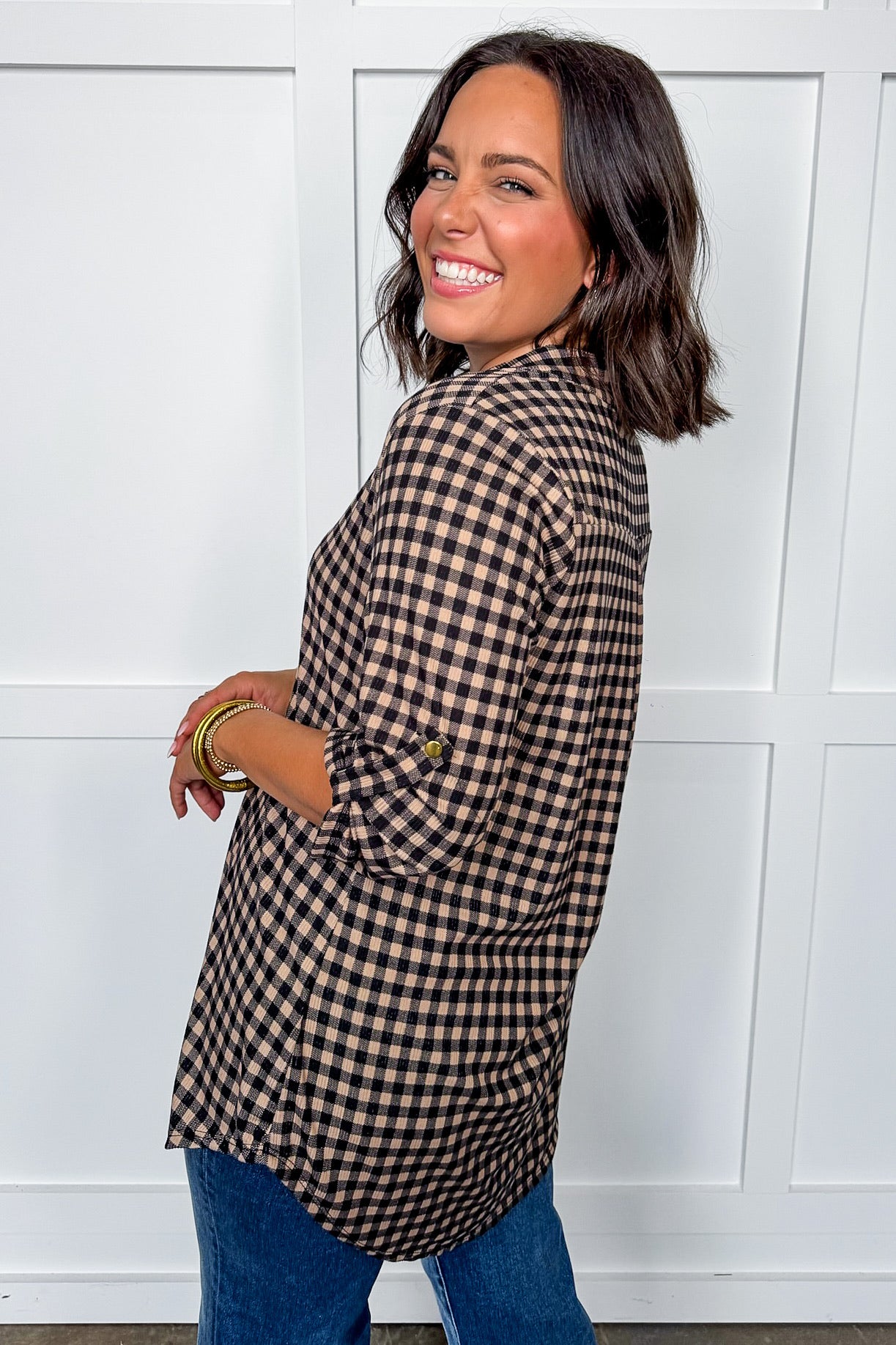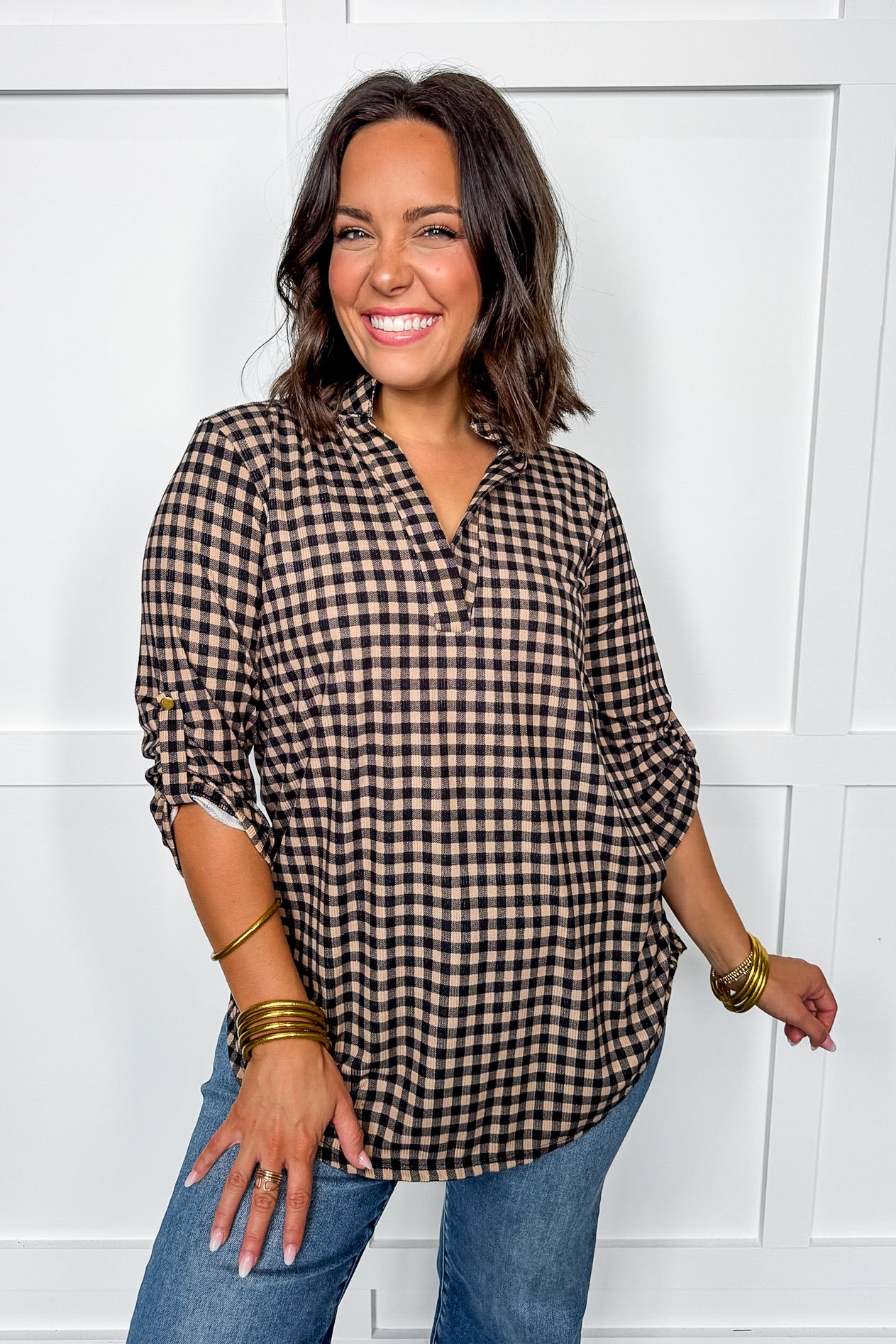 Meet your new everyday favorite — the Checkered Top! This lightweight gingham blouse blends classic charm with casual comfort. With its neutral black-and-tan check pattern, relaxed fit, and split neckline, it’s perfect for dressing up jeans, layering under cardigans, or adding a polished touch to your fall lineup.