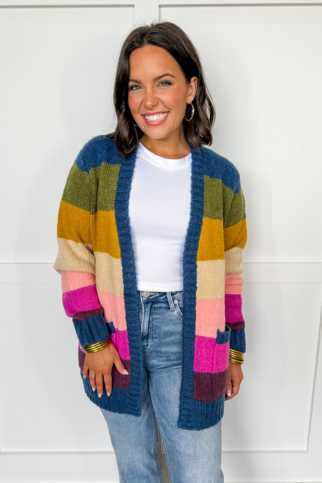 Meet the cardigan guaranteed to brighten even the cloudiest days. The Colors of Joy Cardigan brings a playful mix of bold stripes in cozy, ultra-soft knit—perfect for layering over your favorite basics. Its relaxed fit, open front, and pop-color pockets make it the statement piece your closet has been waiting for. Throw it on for work, weekend errands, or chilly nights out… this cardi does happy like no other.