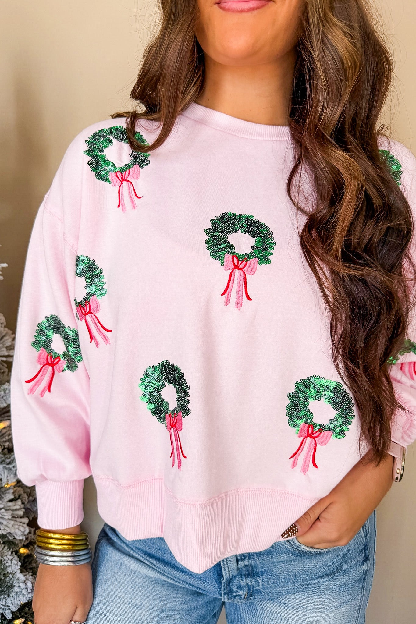 Stay stylish and cozy this winter with The Millie Wreath Sweatshirt. Its sequin bows create a beautiful, unique look that is sure to turn heads. Plus, with its soft fabric and comfortable fit, it will keep you comfy no matter how cold it gets!