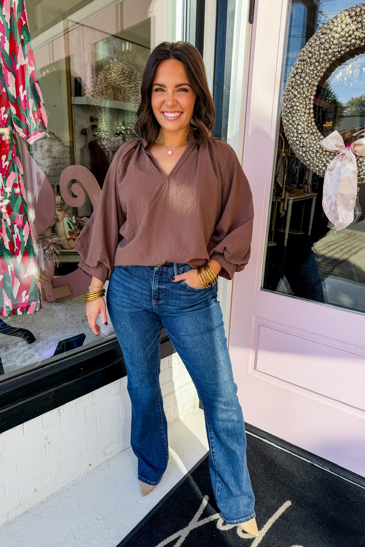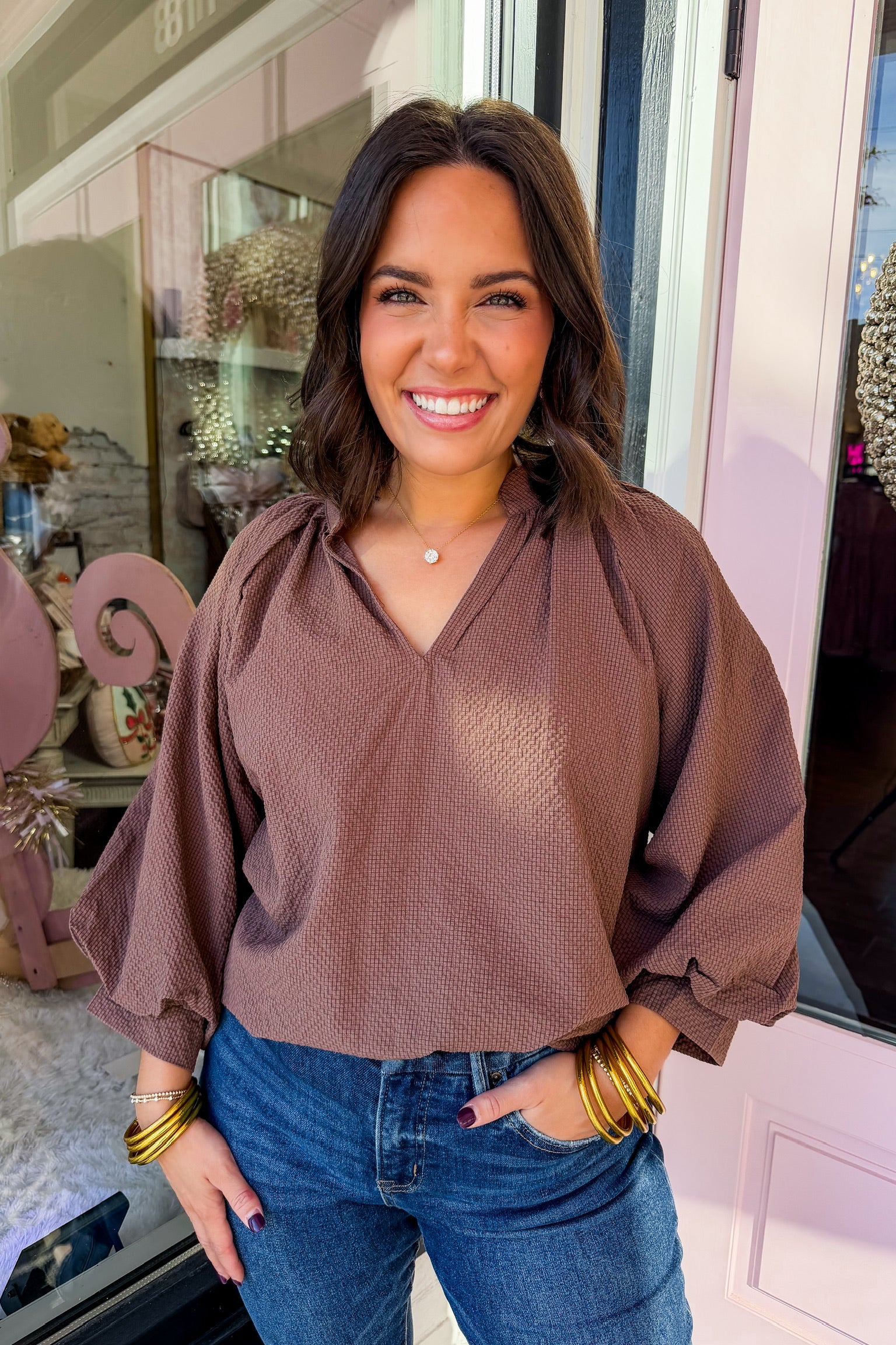 The Mocha Mist Top is the definition of easy elegance. Featuring a soft textured fabric, flowy sleeves, and a flattering v-neckline, this best-seller effortlessly transitions from work to weekend. Pair it with jeans, leather pants, or a midi skirt for a look that feels polished yet relaxed.
