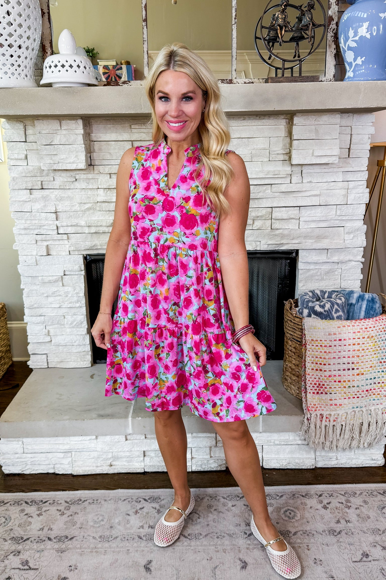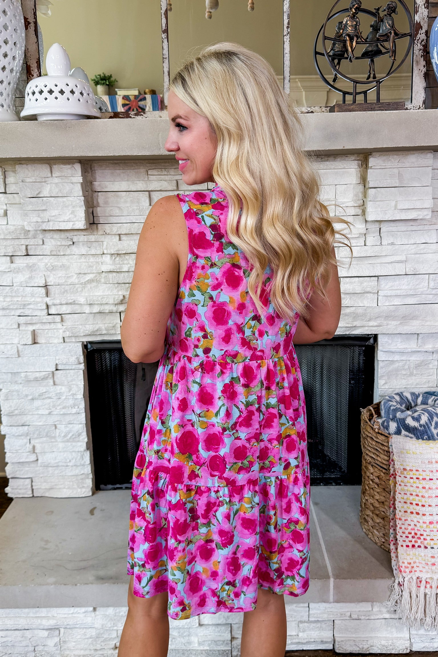 The Lizzy Tiered Pocket Dress in Aqua/Pink Floral