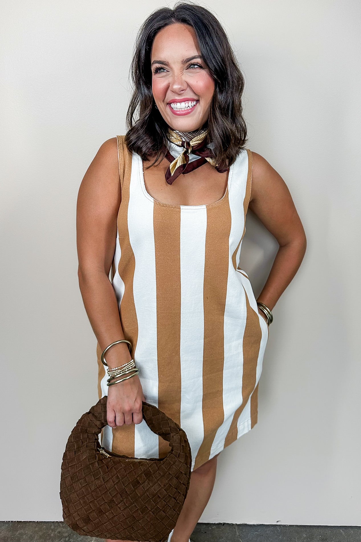 This playful camel and white striped dress adds a splash of fun to your wardrobe. With its thick straps and pockets, it’s practical yet stylish. Falling just above the knee, it offers a breezy fit that’s perfect for throwing on and heading out with ease.