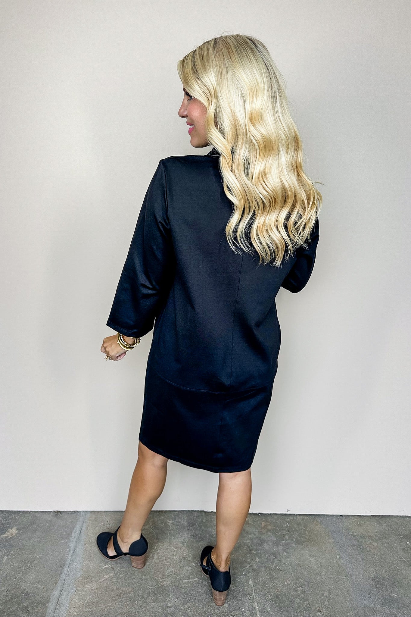 The Dear Scarlett Portfolio Dress in Black combines refined elegance with practical design. With its graceful 3/4 length sleeves and subtle V-neck detail, this dress falls just above the knee, offering a modest silhouette suitable for professional settings. Thoughtfully crafted with pockets, it balances style with convenience. Available in multiple colors, it’s an ideal choice for the office or classroom, blending sophistication with everyday functionality.