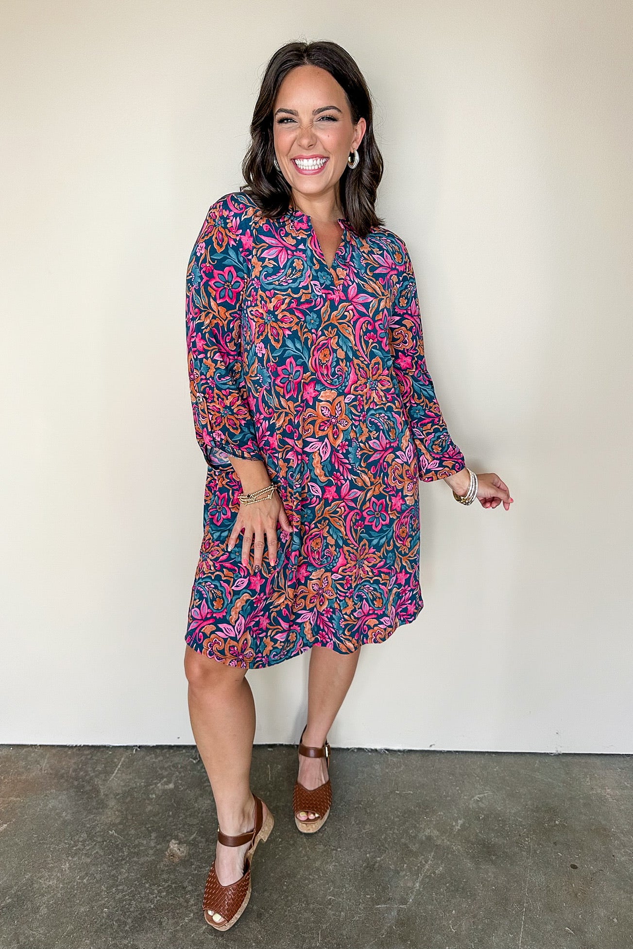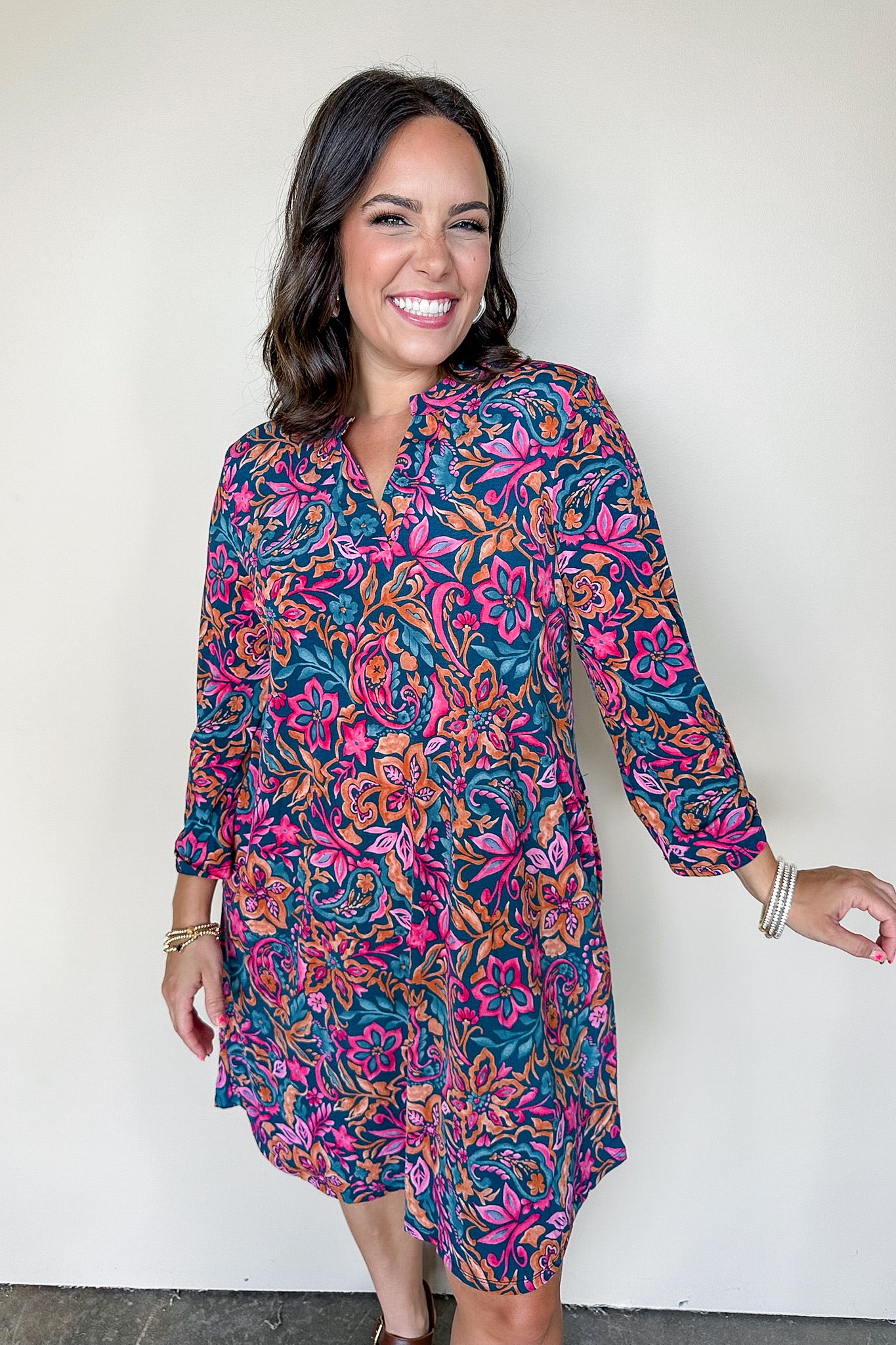 This sophisticated Dear Scarlett Printed Short Dress In Teal features 3/4 length sleeves and breathable, wrinkle-free fabric for effortless elegance throughout your day. Designed with pockets and a flattering cut that hits above the knees, it accommodates both bump and bust, making it perfect for the office or classroom setting. Combining comfort and style, it ensures you look polished and professional with ease.