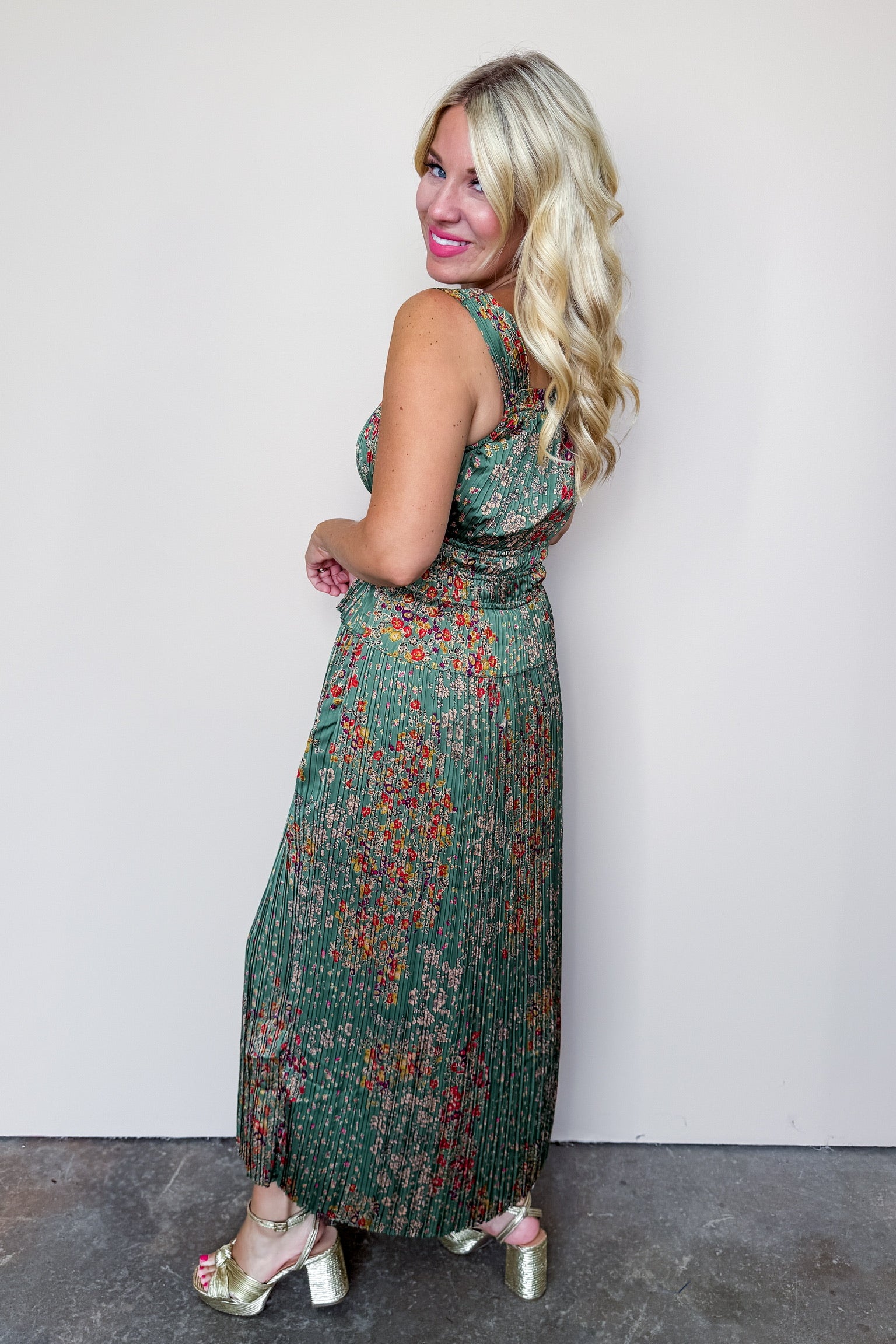 This elegant floral satin midi dress features a sleeveless design and delicate pleated details that add graceful movement. The flowy silhouette and rich green hue with a subtle floral print combine for a refined, feminine look perfect for any sophisticated occasion.