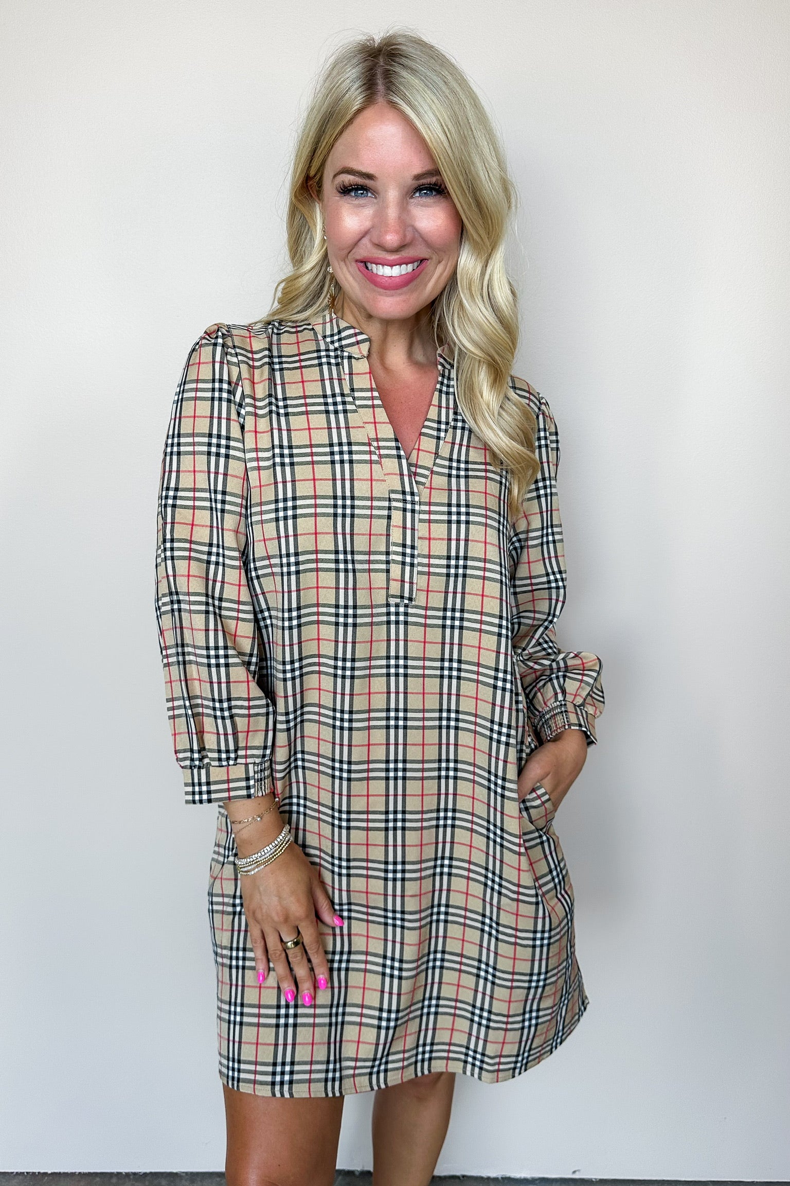 This tan gingham plaid dress, accented with black and red details, brings a playful charm to your wardrobe. Featuring a flattering V-neck and a hem that hits just above the knee, it’s perfect for casual outings or sunny days. Plus, the handy pockets add a fun and practical touch to this stylish short dress.