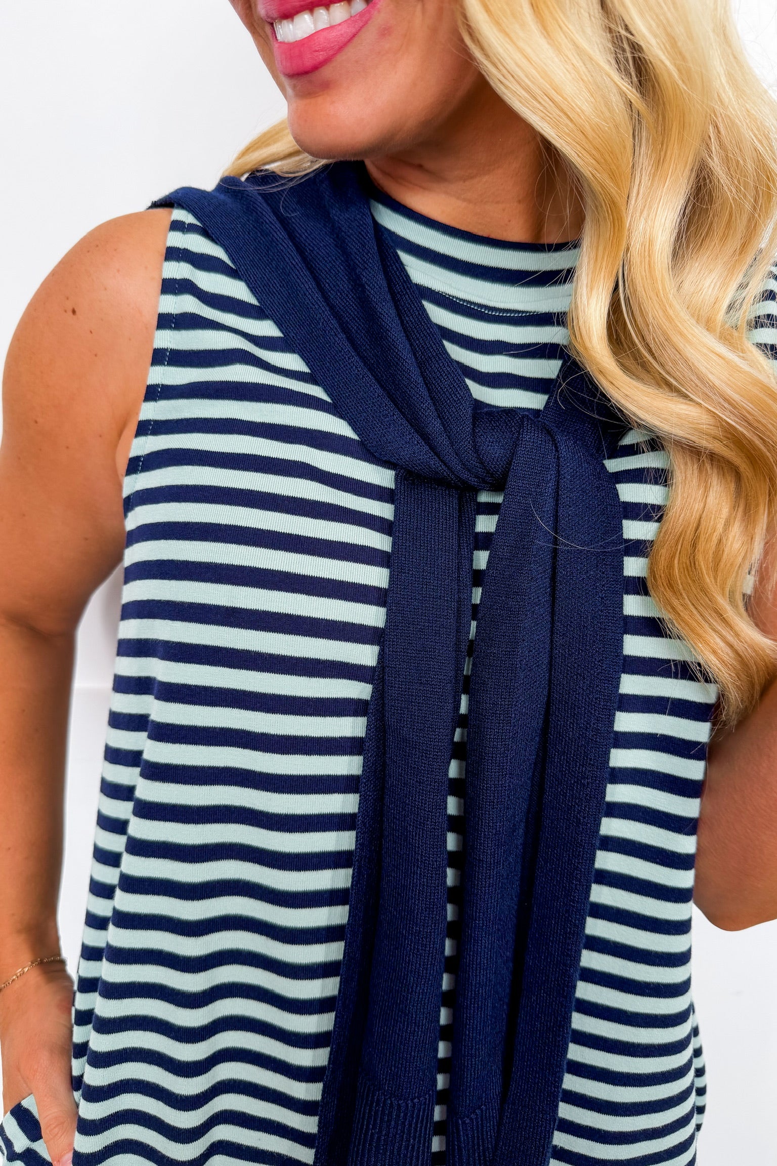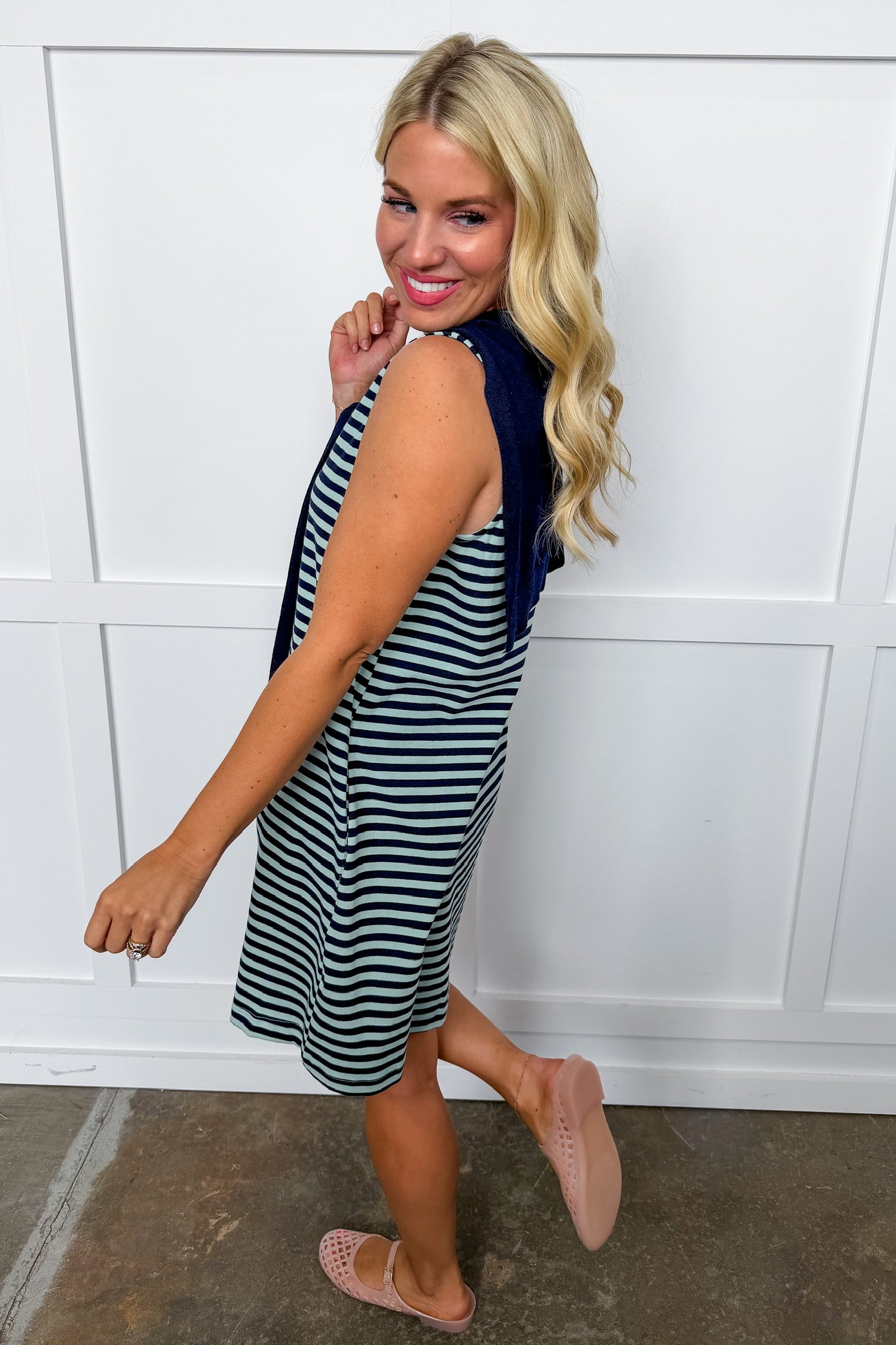 Effortlessly classic with a polished twist, the Preppy Girl Dress with Cardigan Draped Across the Shoulders in Navy Stripes is the definition of timeless style. Featuring crisp stripes, this dress is designed with a flattering sleeveless silhouette and an attached cardigan detail draped across the shoulders for that iconic preppy look. Finished with hidden side pockets and an easy, comfortable fit, it's perfect for everything from brunch and shopping days to casual office wear or weekend outings.