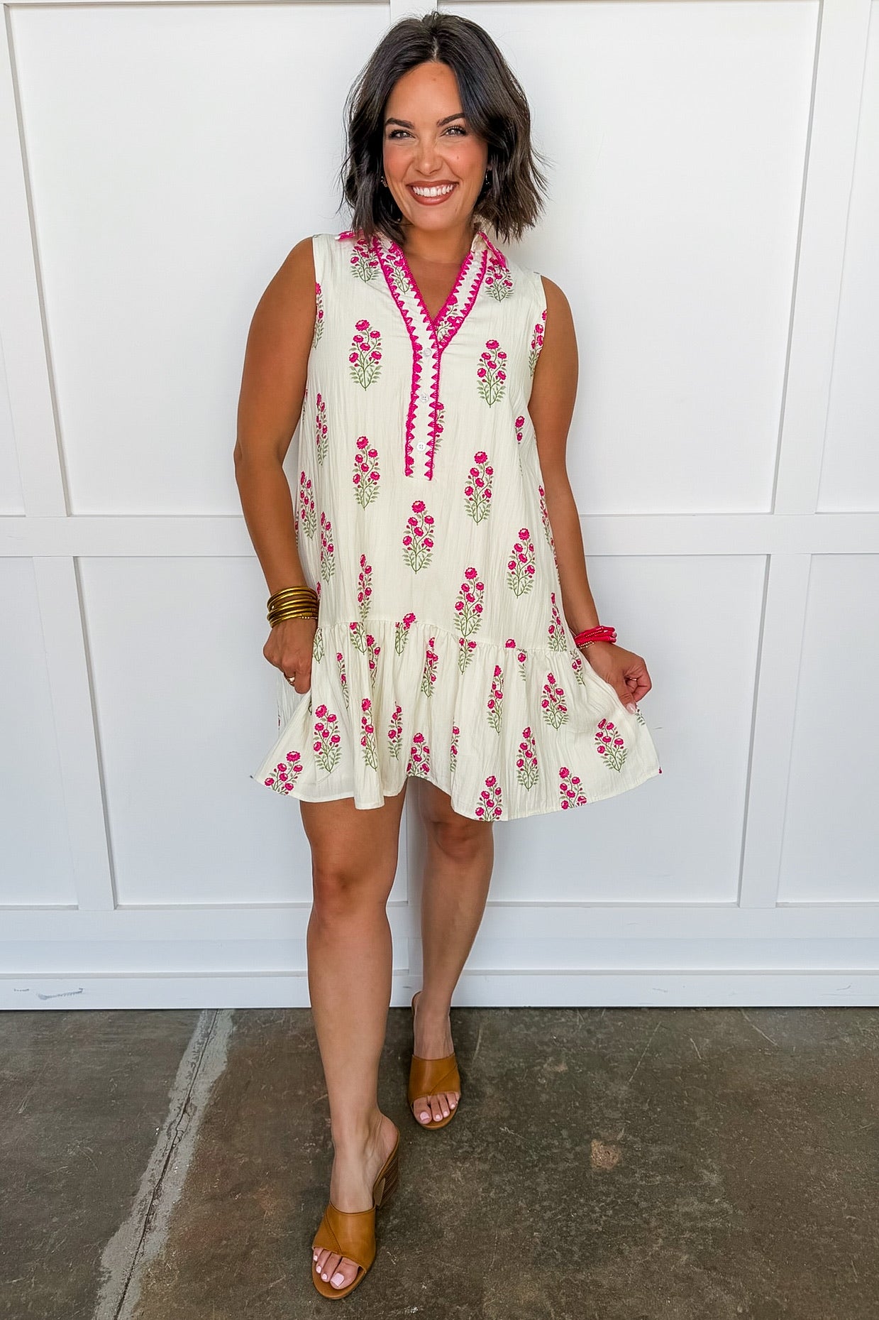 Designed with a breezy swing silhouette, this sleeveless mini dress features a soft ivory backdrop adorned with delicate pink floral prints throughout. The split neckline is accented with vibrant pink trim for the prettiest pop of color, while the tiered hem adds movement and playful charm.