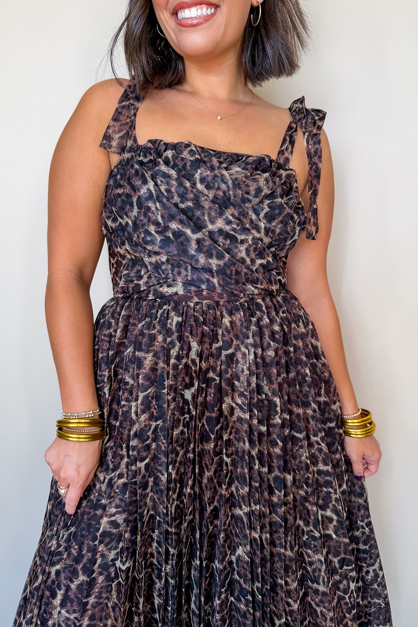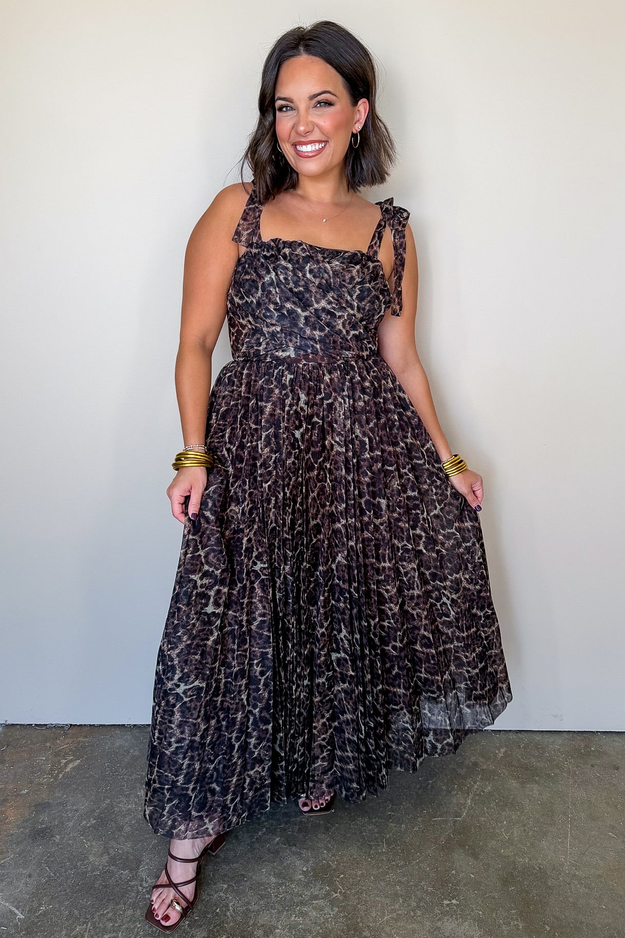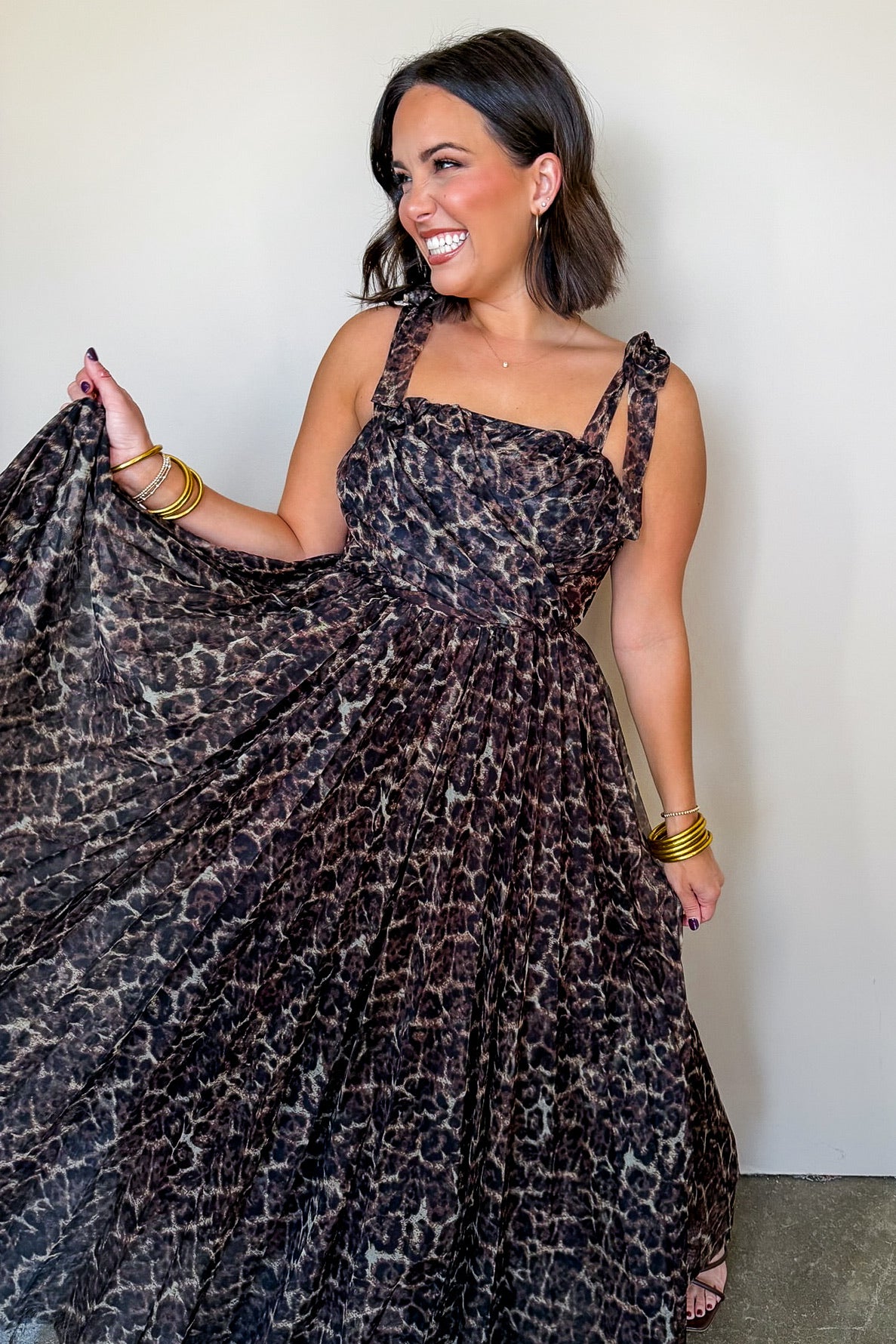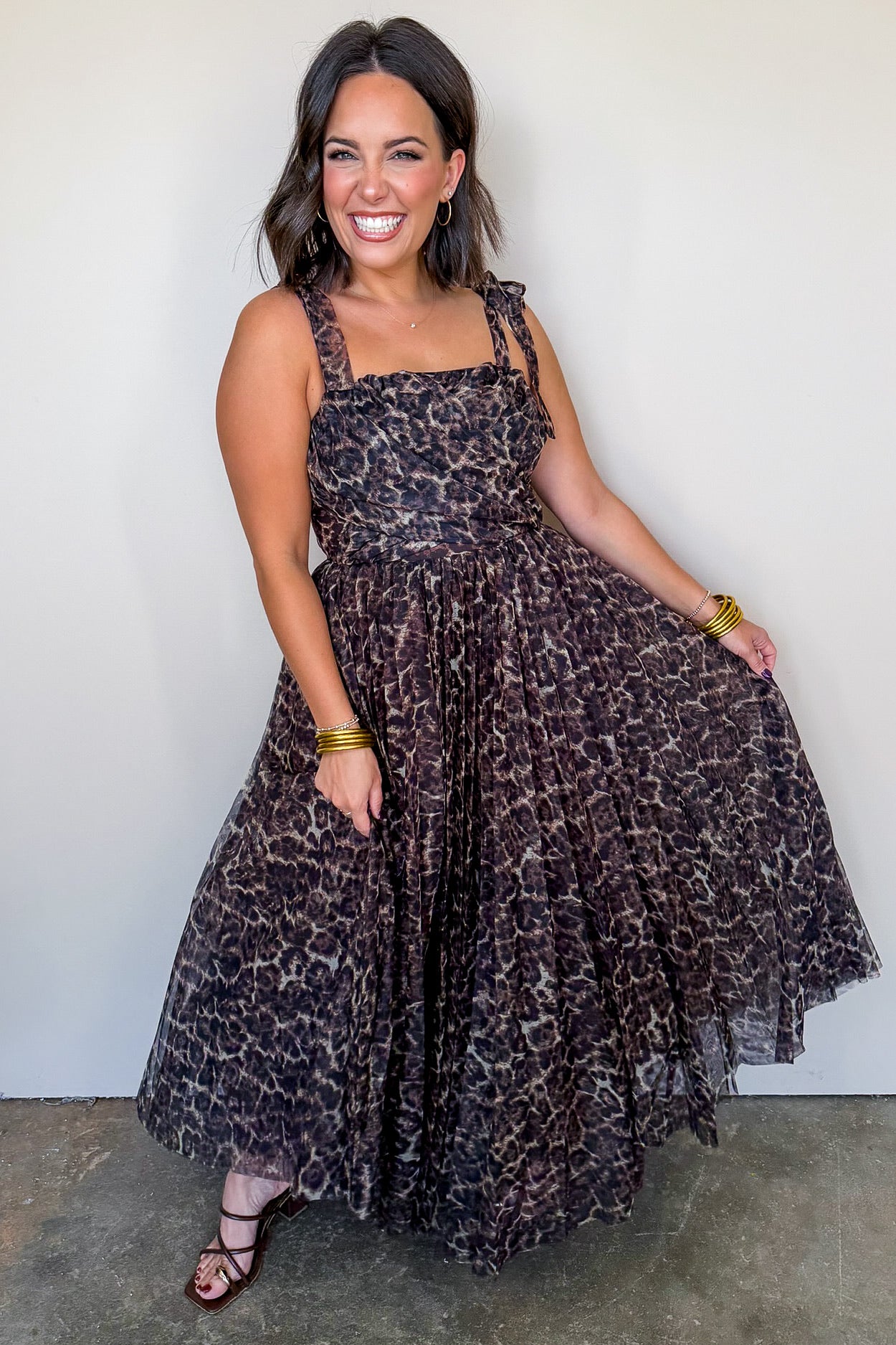 Unleash your inner wild elegance with the Savannah Nights Midi Dress. This stunning leopard-print dress features a romantic pleated skirt and playful tie shoulder straps that add a flirty, feminine touch. The smocked bodice hugs your curves comfortably while the flowy tulle overlay creates effortless movement with every step. Perfect for cocktail parties, date nights, or festive gatherings — this dress is a showstopper for any occasion.