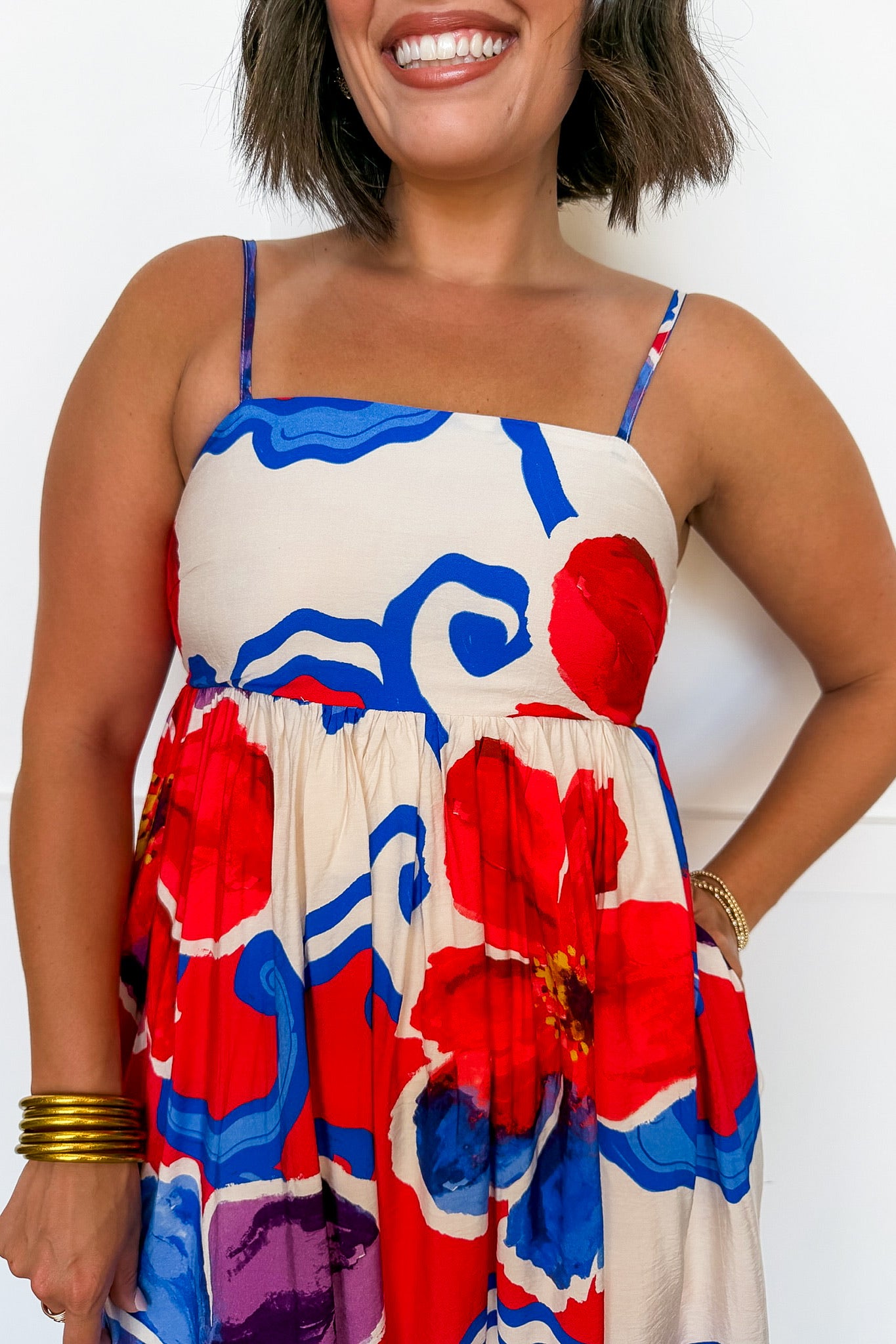 Featuring a stunning oversized floral print in striking shades of red, blue, purple, and white, this flowy maxi dress brings effortless statement style. Designed with a flattering empire waist, adjustable spaghetti straps, and breezy movement throughout, it’s the perfect piece for vacations, summer parties, or patriotic celebrations.