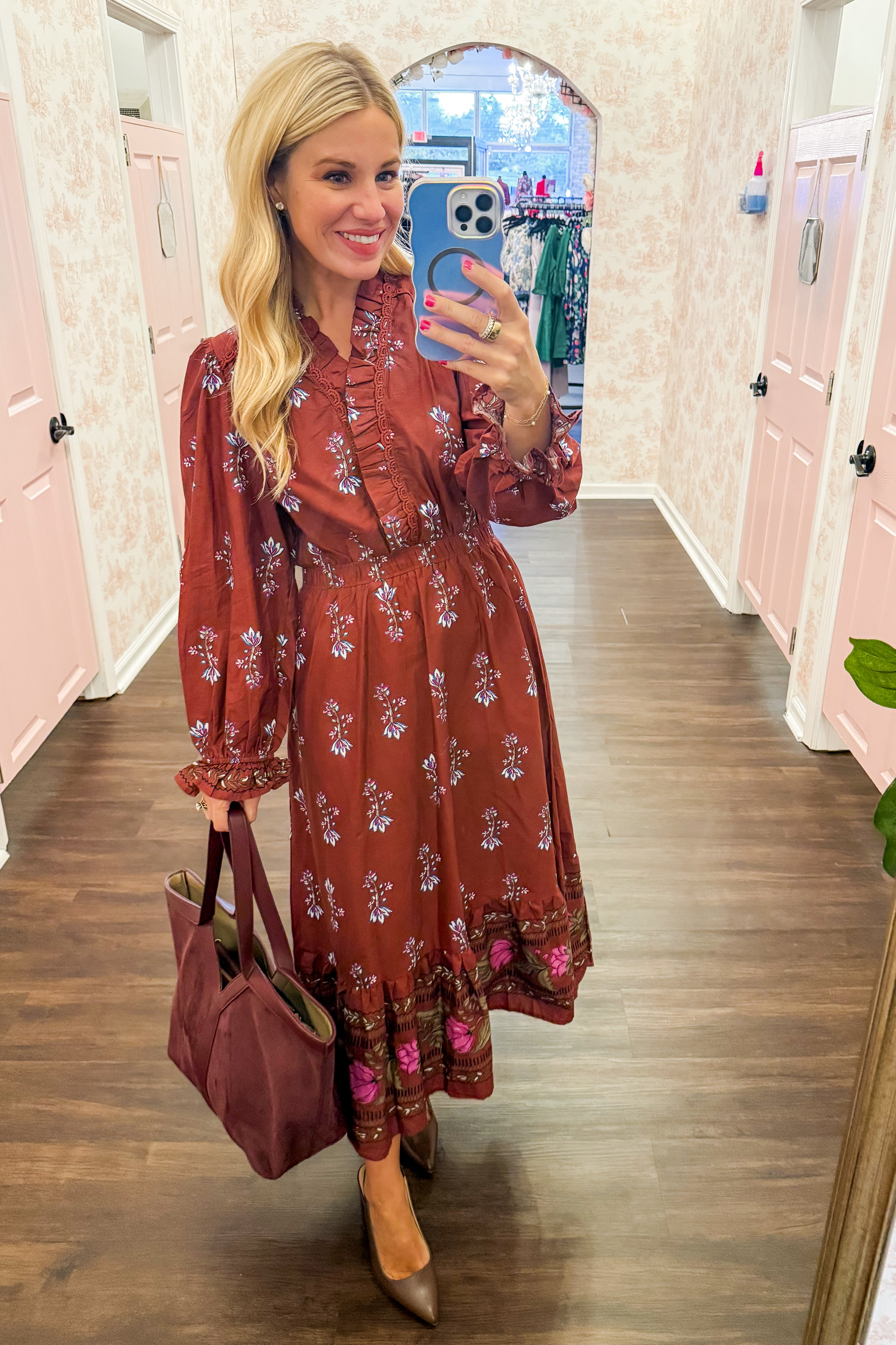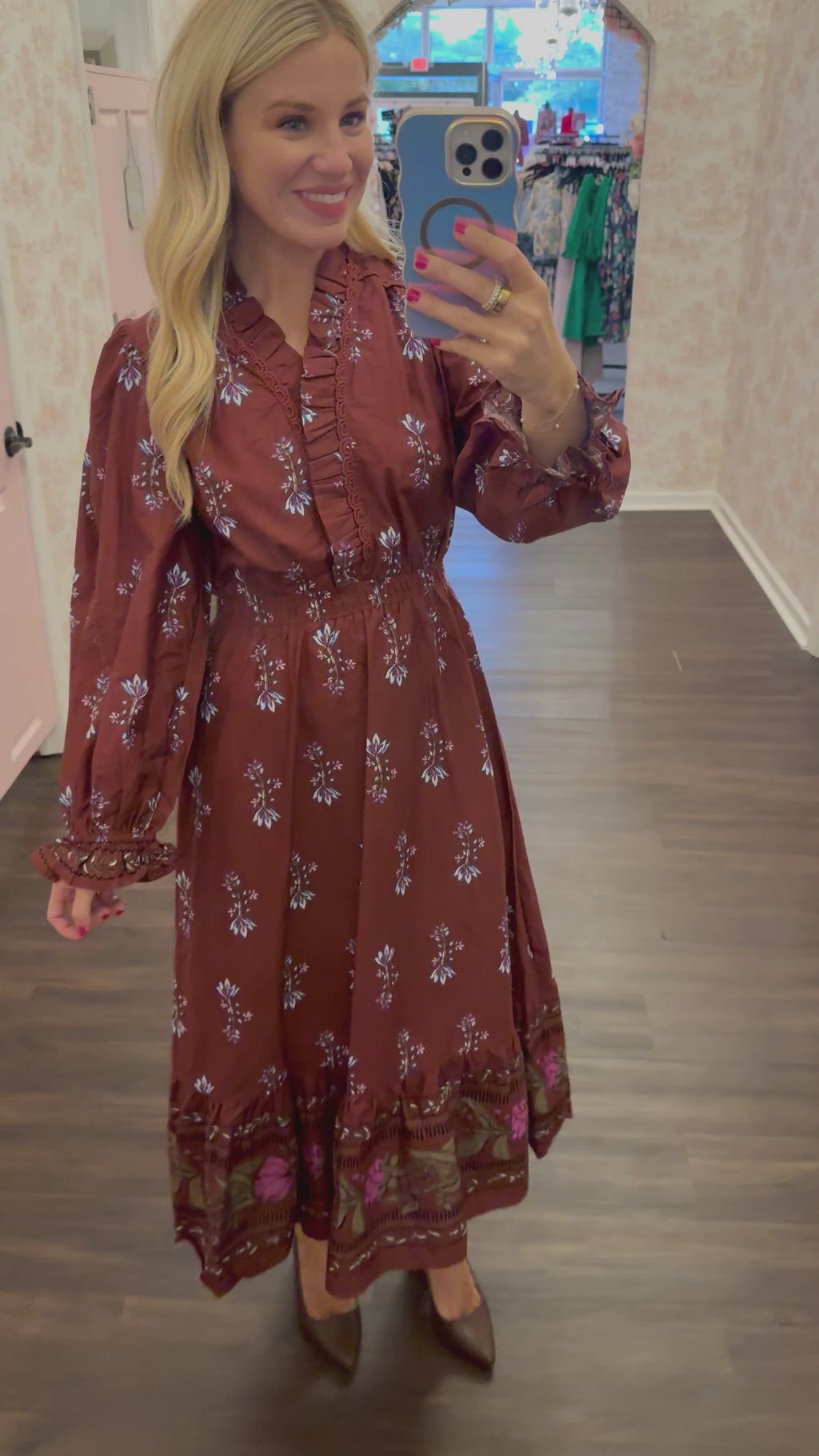 Float through your day in the Juliette Floral Printed Maxi Dress in Burgundy! This stunning  dress features delicate ruffle details and a flattering smocked waist that cinches you in just right. With its soft fabric and easy, flowy fit, it’s perfect for weddings, date nights, or simply feeling beautiful wherever you go. Pair with simple sandals for a daytime look or dress it up with heels and gold jewelry for an effortlessly elegant vibe.