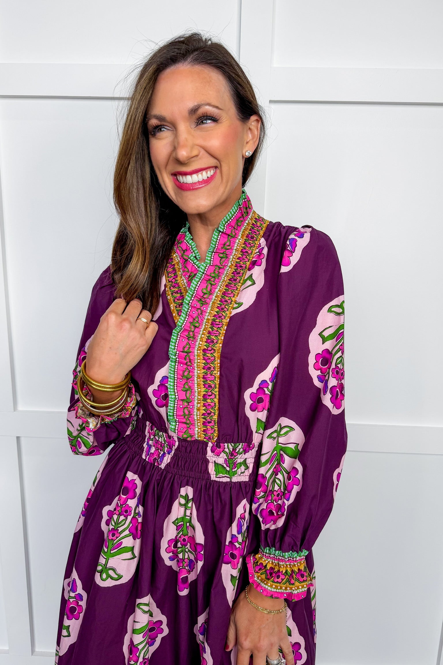 Float through your day in the Juliette Floral Printed Maxi Dress in Plum! This stunning dress features delicate ruffle details and a flattering smocked waist that cinches you in just right. With its soft fabric and easy, flowy fit, it’s perfect for weddings, date nights, or simply feeling beautiful wherever you go. Pair with simple sandals for a daytime look or dress it up with heels and gold jewelry for an effortlessly elegant vibe.