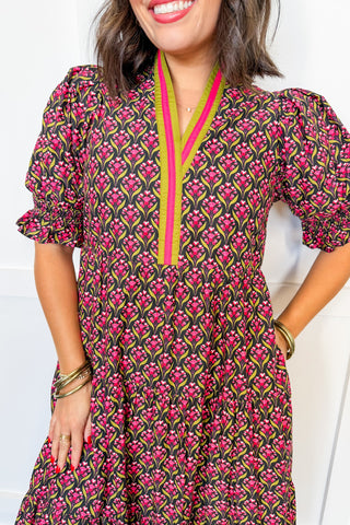Hot Pink Deal - Collared Notch Neck Blue Floral Tiered Ivory Midi Dress