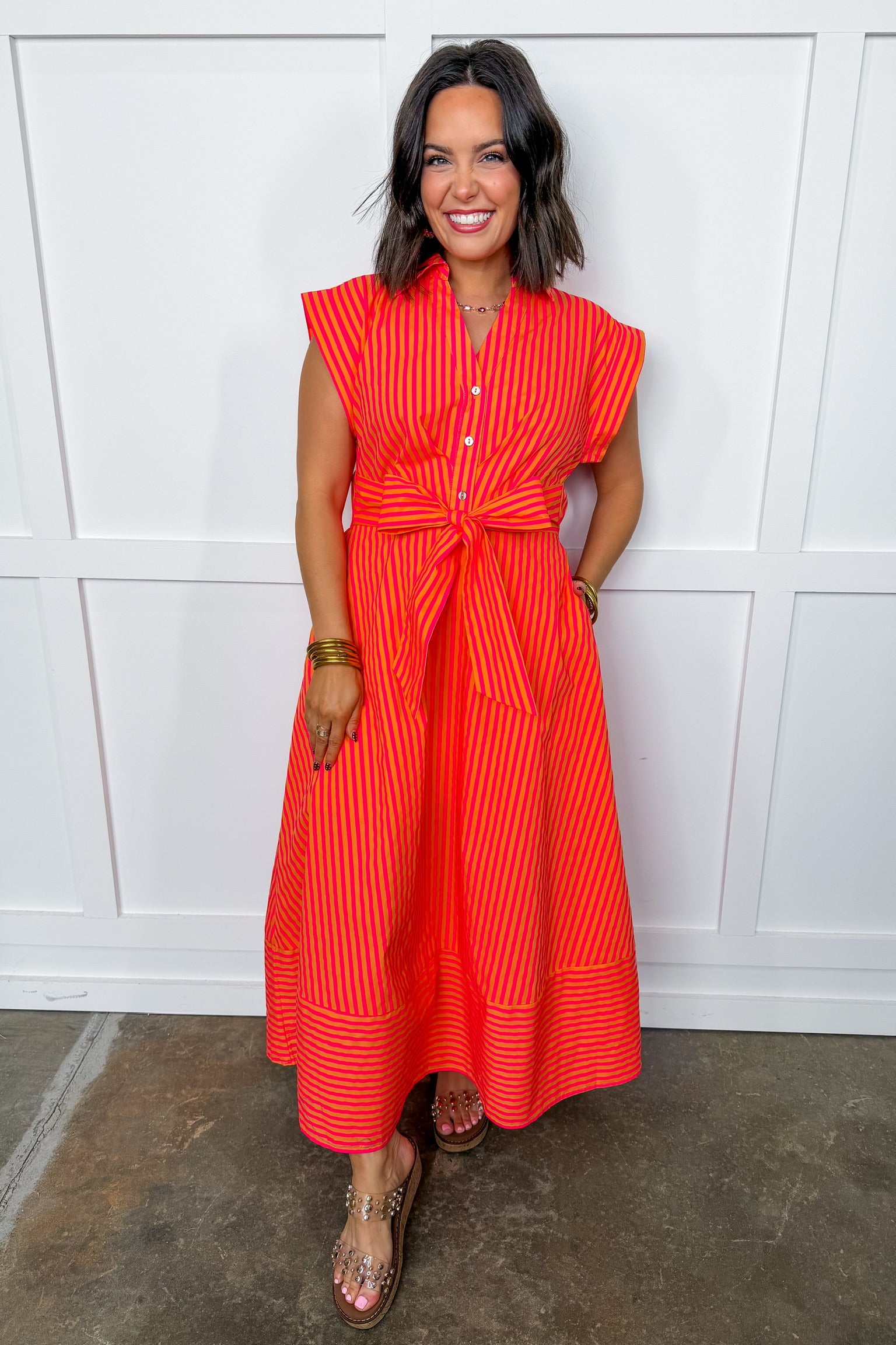 Bold, bright, and impossible to ignore, the Made to Stand Out Midi Dress is your go-to for days when you want your outfit to do the talking. Featuring vibrant vertical stripes in cheerful orange and pink, this dress is designed with a flattering button-front silhouette and a self-tie waist that cinches just right. Finished with functional side pockets and an easy, flowy skirt, it’s the perfect mix of fun and effortless for brunch dates, vacations, or sunny everyday plans.