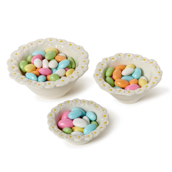 Sweet, charming, and perfect for spring entertaining, the Daisy Serving Bowl Set adds a playful touch to any table. Featuring a delicate scalloped edge with hand-painted daisy details, these bowls are ideal for candies, nuts, dips, or seasonal treats.