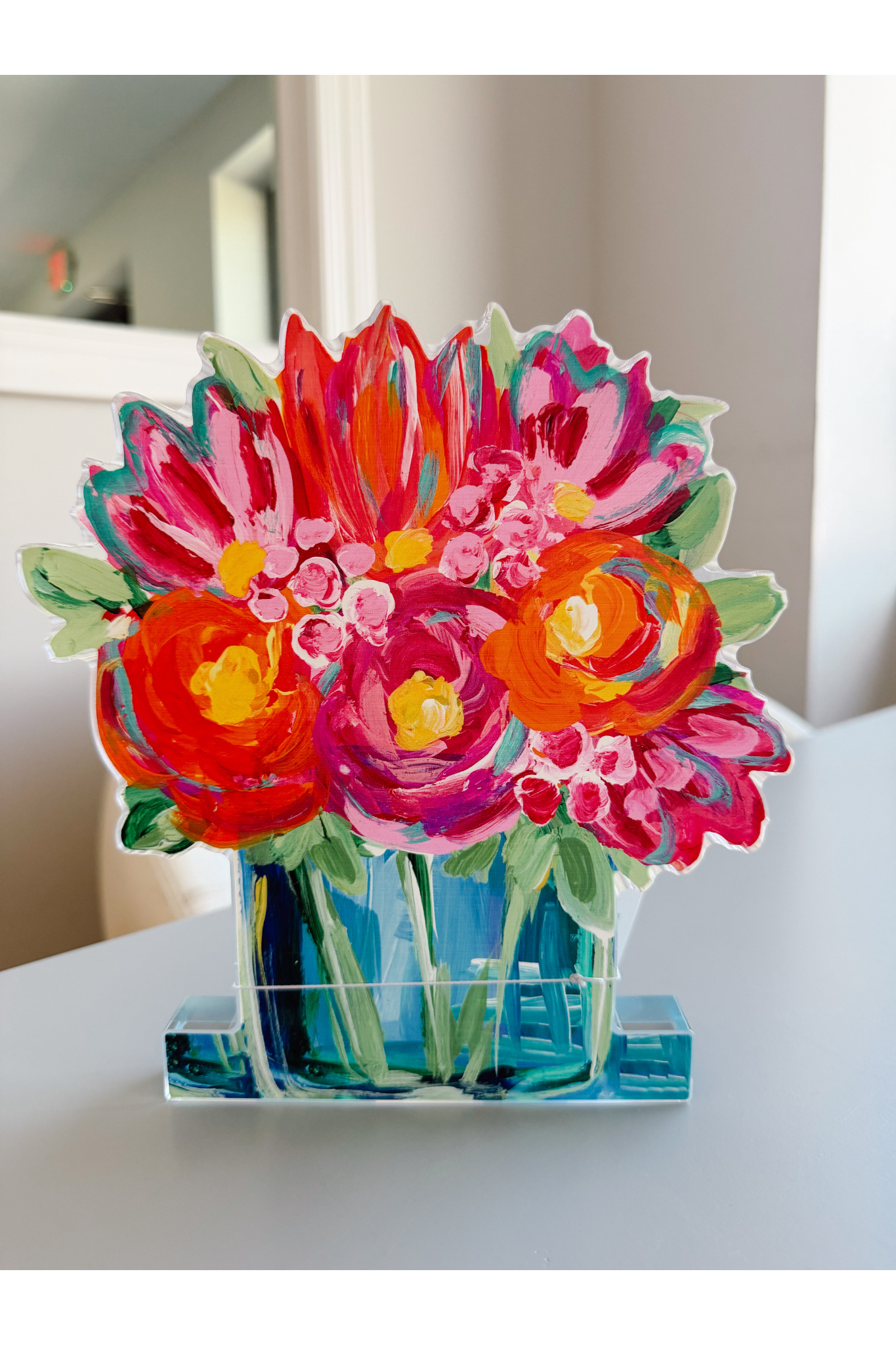 Turn up the color with this vibrant floral acrylic stand. Featuring a bold bouquet of pink, coral, and orange blooms arranged in a soft blue vase, this piece instantly energizes any space.