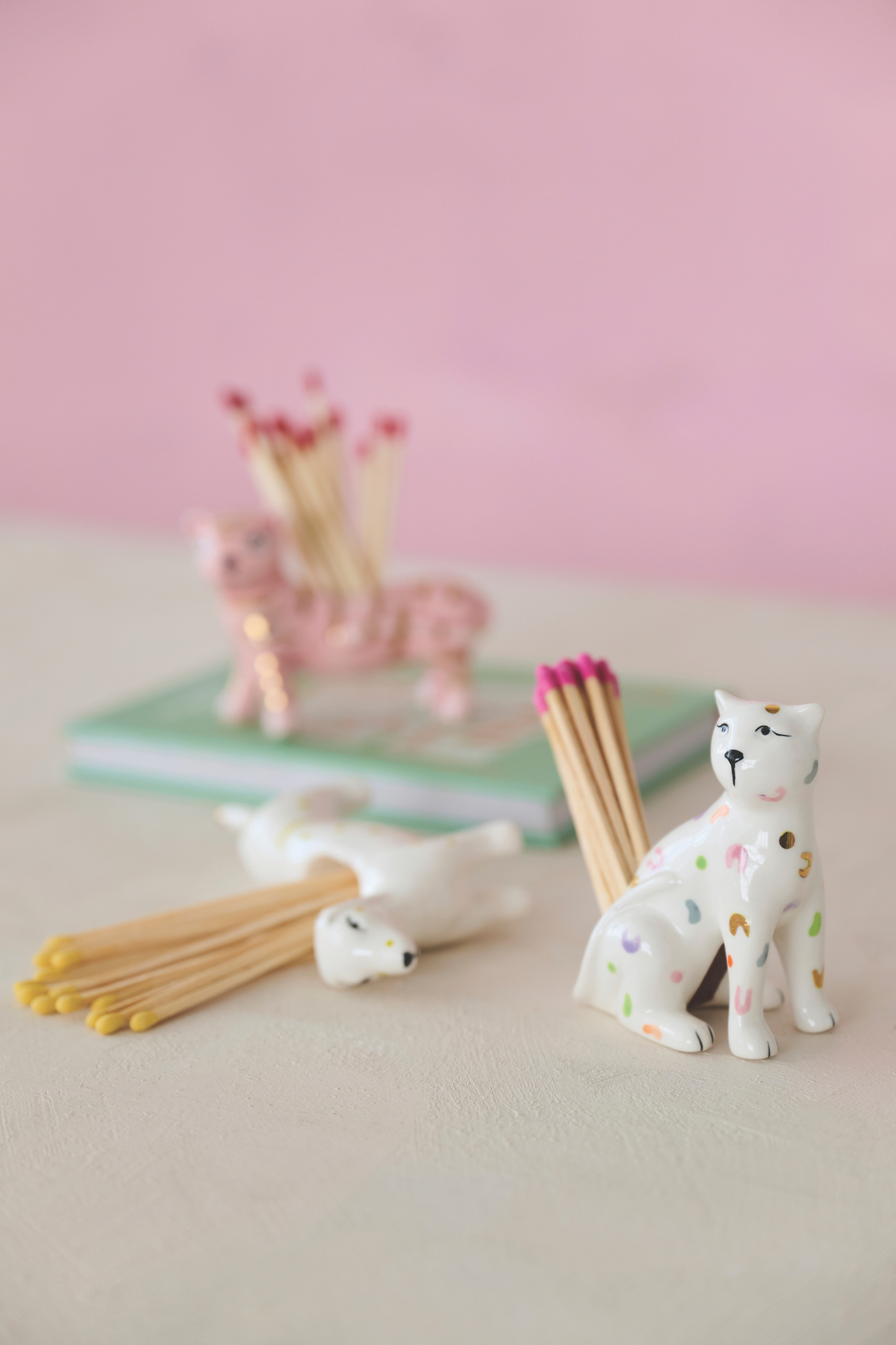 Function meets charm with these adorable stoneware match holders, each featuring a built-in golden strike strip and a playful animal silhouette. Designed to hold matches while doubling as a decorative accent, these pieces are perfect for styling next to candles on coffee tables, trays, or shelves.