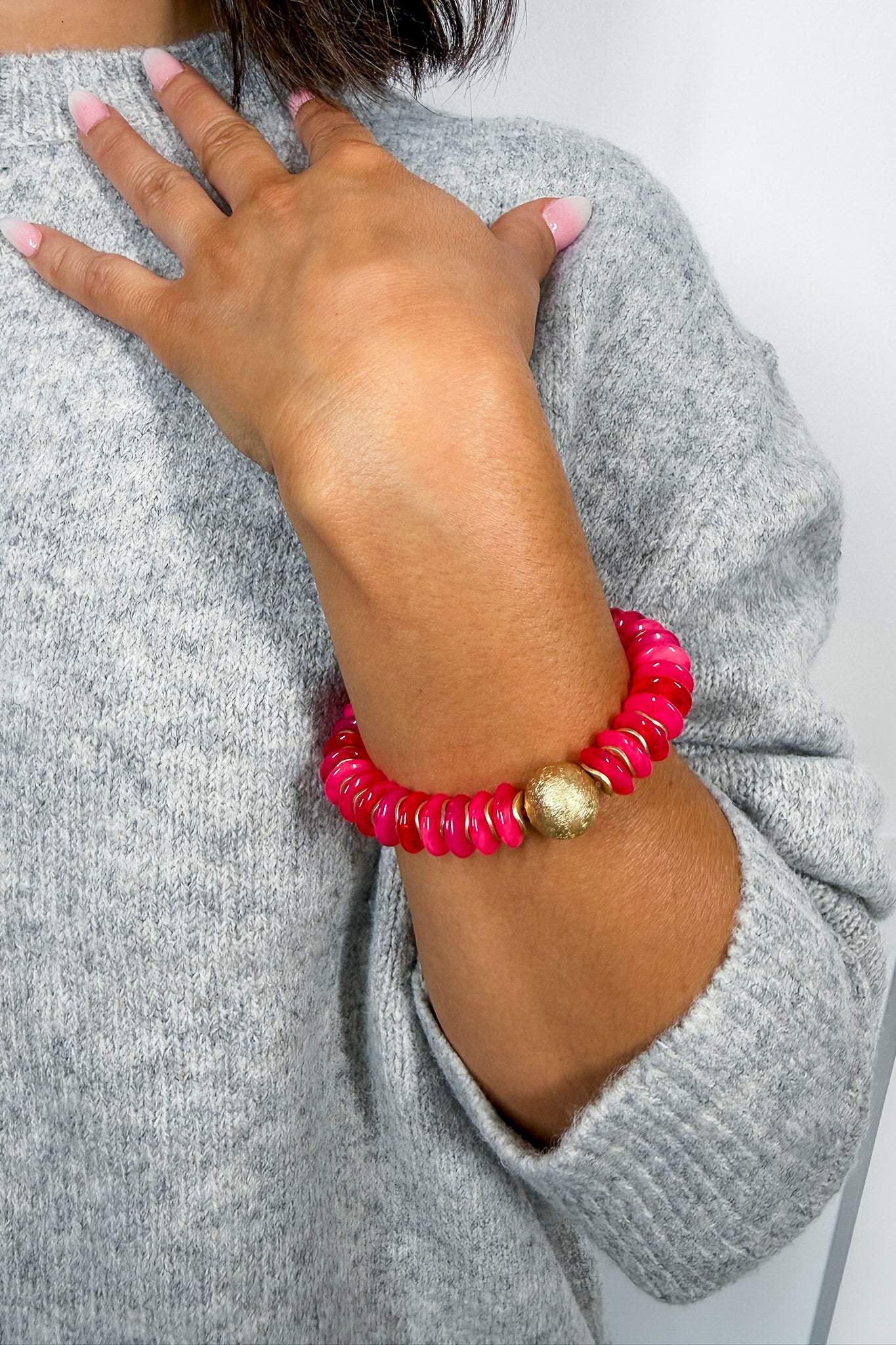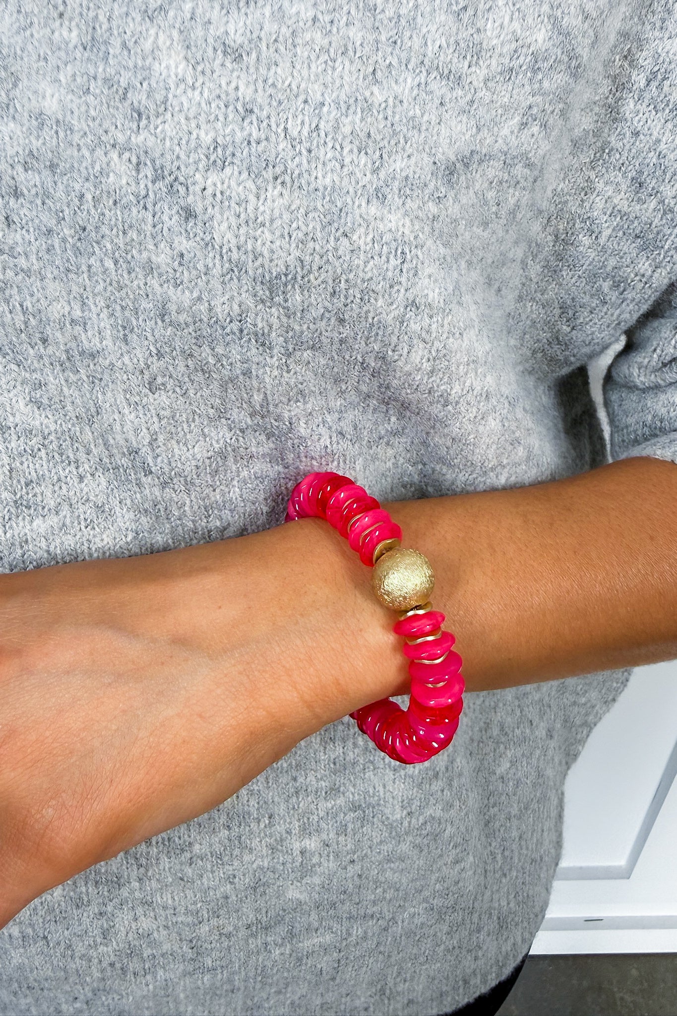 That bracelet is so fun and vibrant!  The chunky beaded texture with that gold accent gives it a luxe-but-playful vibe — and the fact that it comes in multiple colors makes it perfect for mixing, gifting, or stacking.