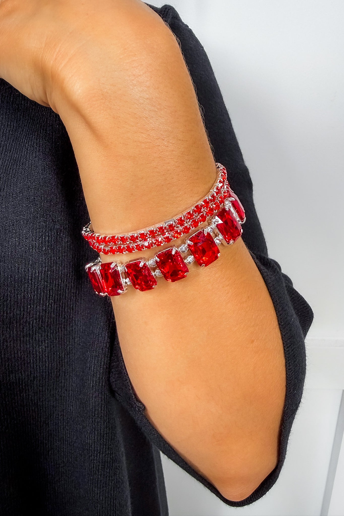 Bring the drama with the Scarlet Shine Bracelet Set. This stunning red bracelet set features one bold, statement-making gem bracelet and one slim rhinestone strand — perfect together or worn solo for a pop of holiday sparkle. The radiant ruby tone adds the perfect festive finish to your holiday and party looks.