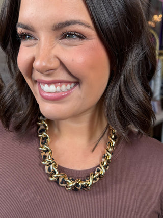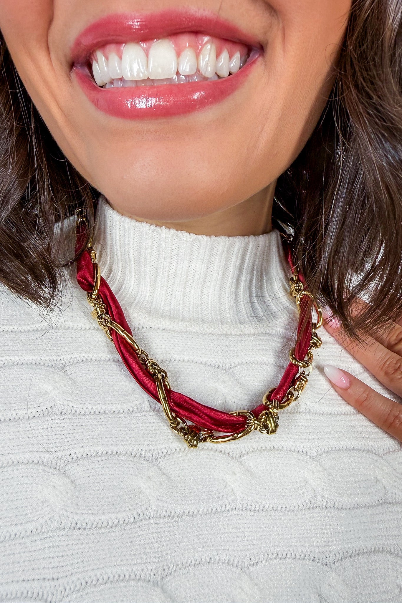 This necklace brings together rich satin and bold gold for a look that’s effortlessly elevated. Twisted red silk threads weave through chunky gold links, creating a statement piece that feels both romantic and modern. Style it with a simple black dress, a crisp blouse, or a cozy knit — it’s the definition of polished glamour for any season.