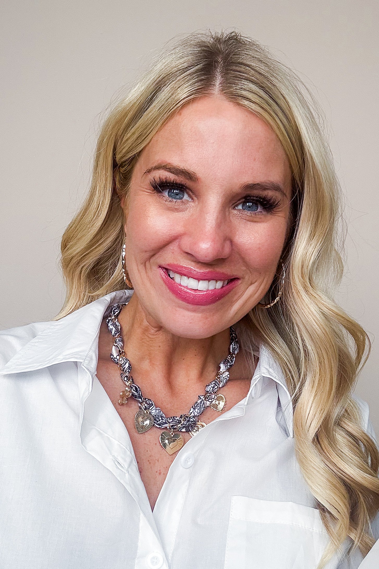 Fall in love with the details of our Golden Heart Charm Scarf Necklace, a stunning fusion of vintage romance and bohemian flair. This elegant necklace features a silky patterned scarf interwoven with a gold-tone chain, adorned with heart and floral charms for a touch of timeless charm.