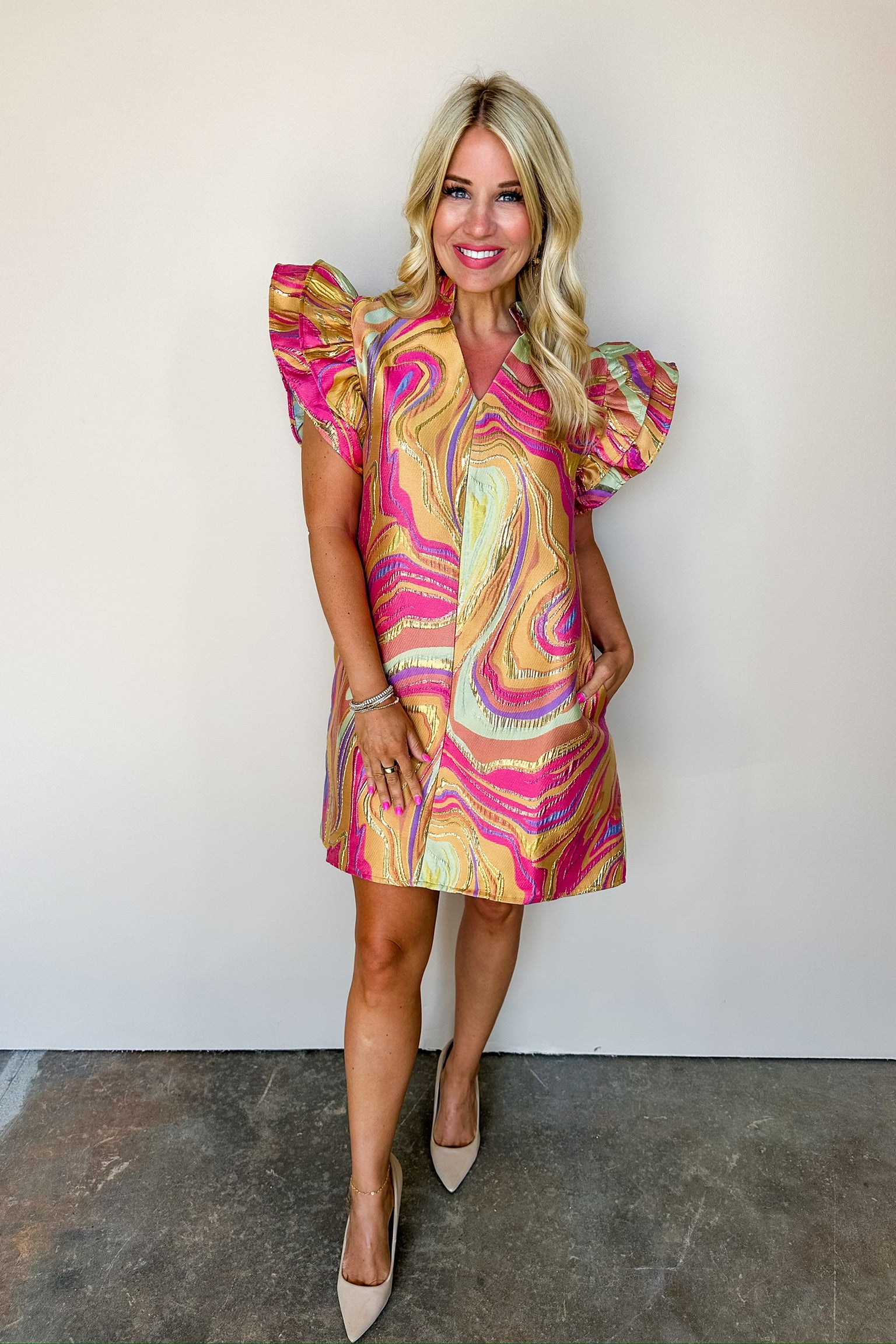 Turn heads in the Golden Hour Swirl Dress, a vibrant statement piece featuring bold marbled swirls of gold, pink, and mint. The fluttery ruffle sleeves add a playful touch, while the metallic accents give just the right amount of shine. Perfect for parties, events, or anywhere you want to shine from day to night.