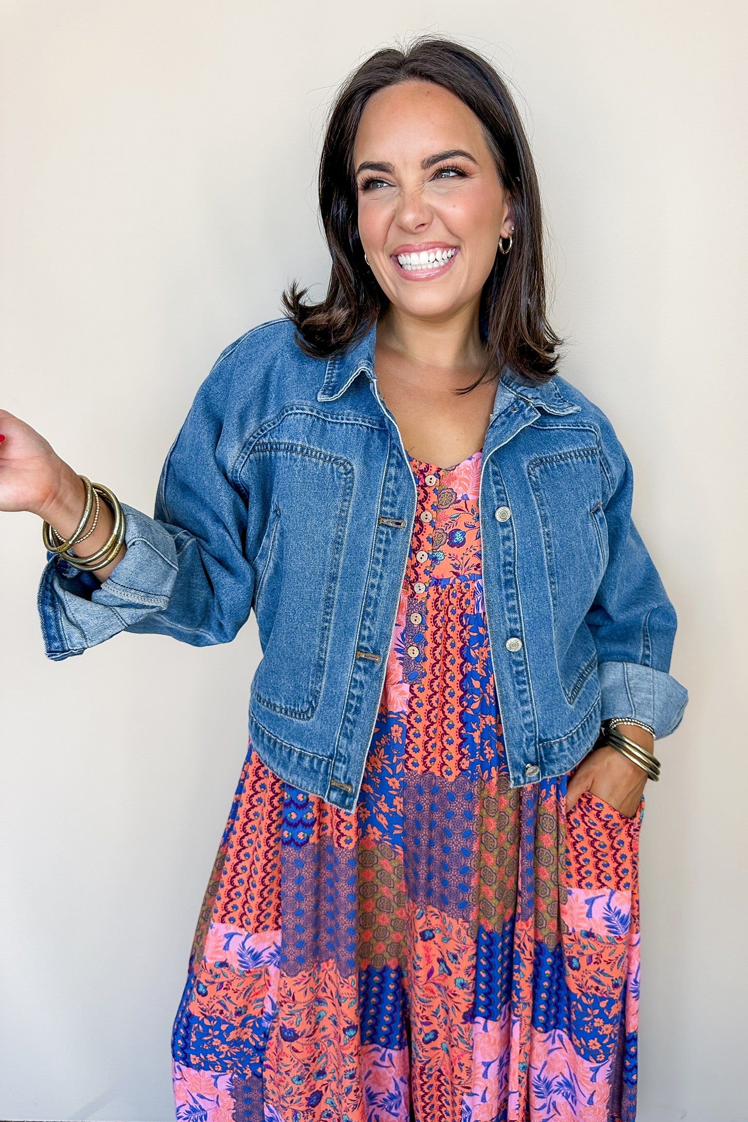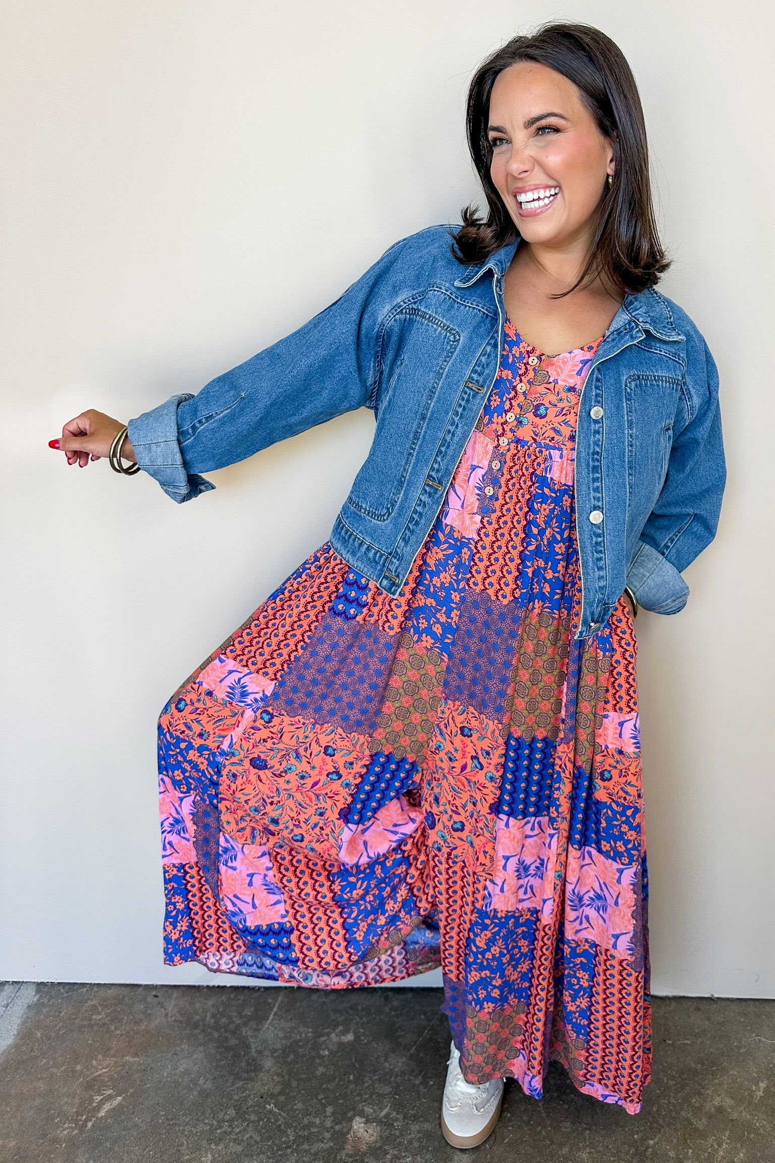 Indulge in the boho vibes of our Wooden Button Down Sleeveless Jumpsuit! With wide flowy legs and pockets, this oversized piece is perfect for a free-spirited look. The coral and blue patchwork print adds a touch of boho vibes. Perfect for those who crave comfort and style!
