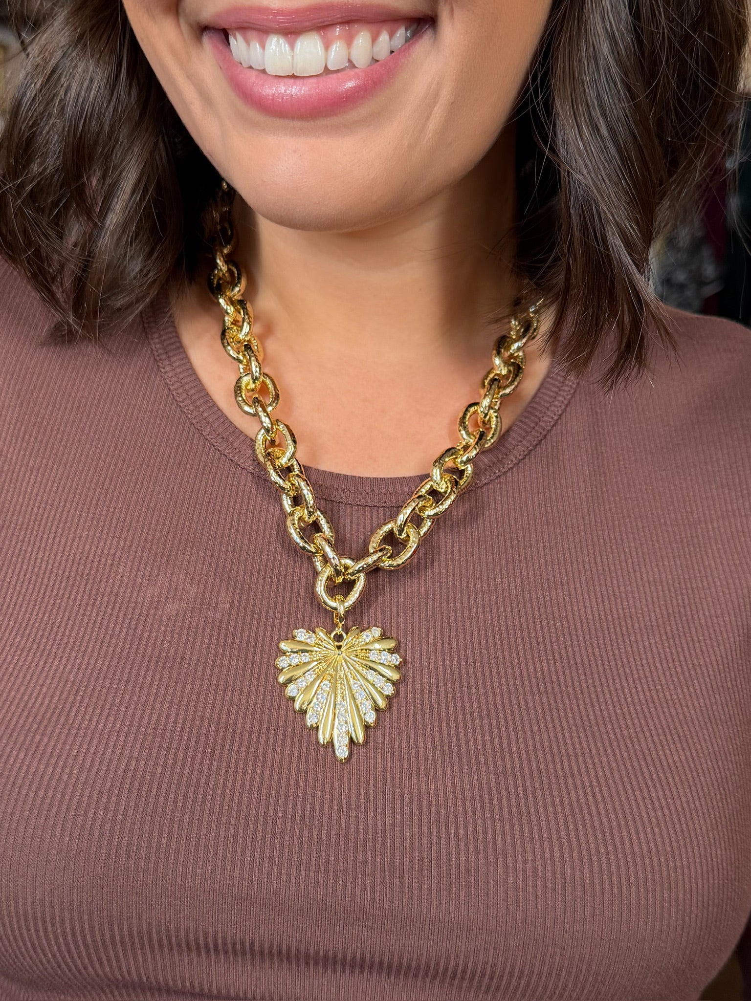 Make a statement with The Radiant Heart Necklace — where bold meets timeless. Featuring chunky textured gold links and a gleaming heart pendant detailed with sunburst rays and crystals, this piece instantly elevates any outfit. Whether layered with dainty chains or worn solo, it’s a showstopper that adds that golden glow to every look.