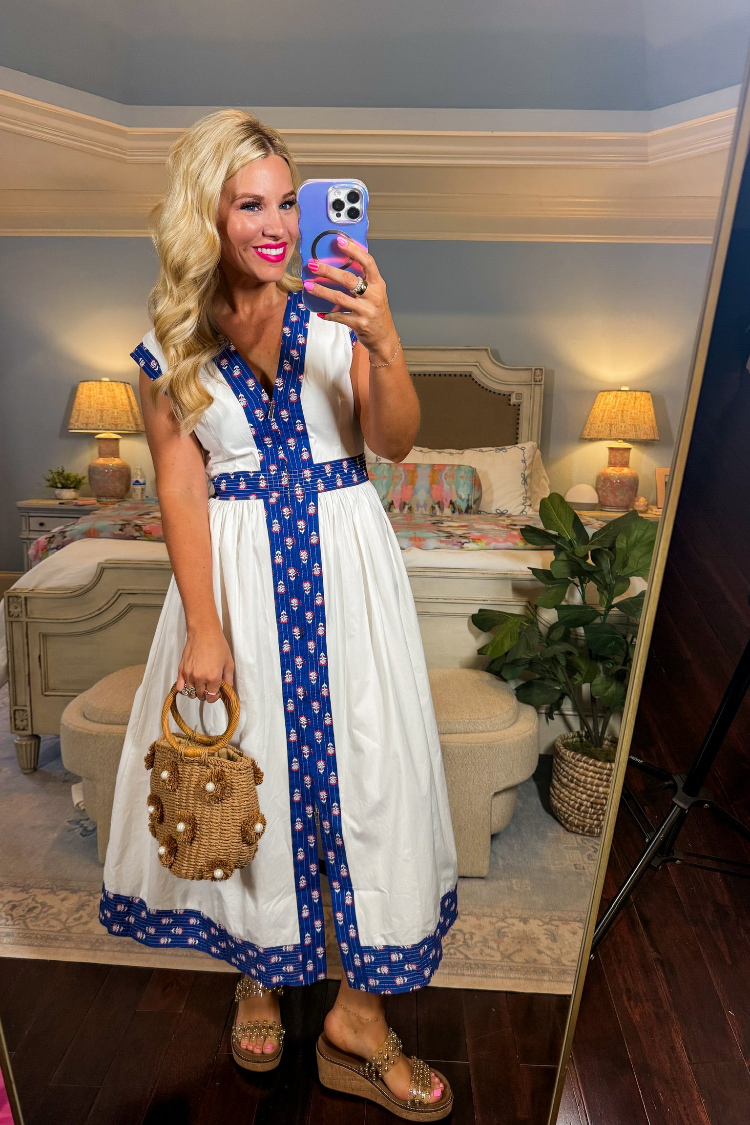 Rooted in cottage charm and effortless elegance, the Best Selling Krissy Zip Up Midi Dress in White Floral Trim features a crisp white base accented with delicate blue floral trim for a timeless, heirloom-inspired look. Designed with a flattering V-neckline, a defined waist, and a flowing midi-length silhouette, this dress feels both romantic and easy to wear. Perfect for garden strolls, brunch dates, or quiet weekends spent outdoors, it’s a piece you’ll reach for when you want something special yet relaxed.