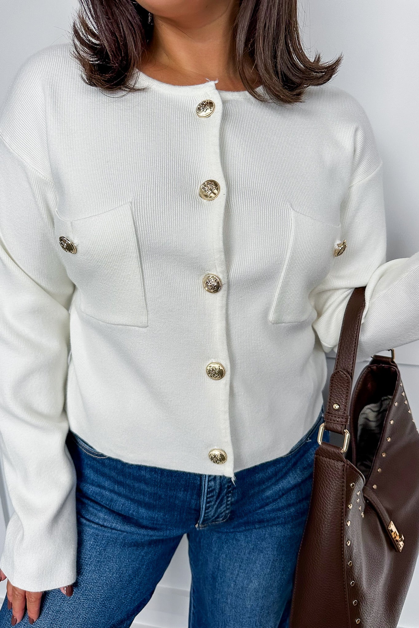 Wrap yourself in cozy charm with this Beloved Front Button Ivory Cardigan. The fitted silhouette and classic crew neck give it a sleek look, while the shiny gold buttons add just the right hint of sparkle. Perfect for layering or wearing solo, its long sleeves keep you comfy and chic all day long.