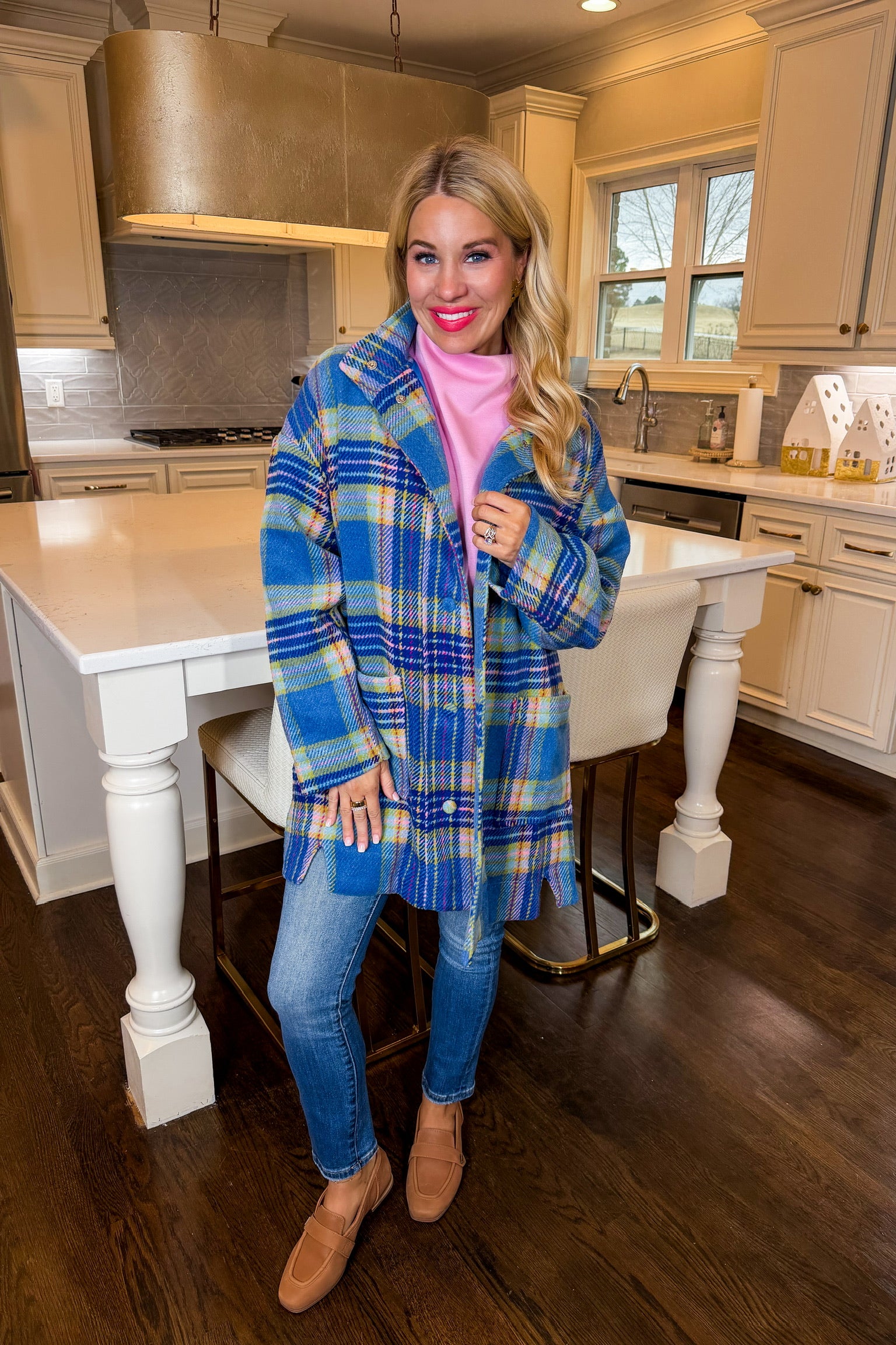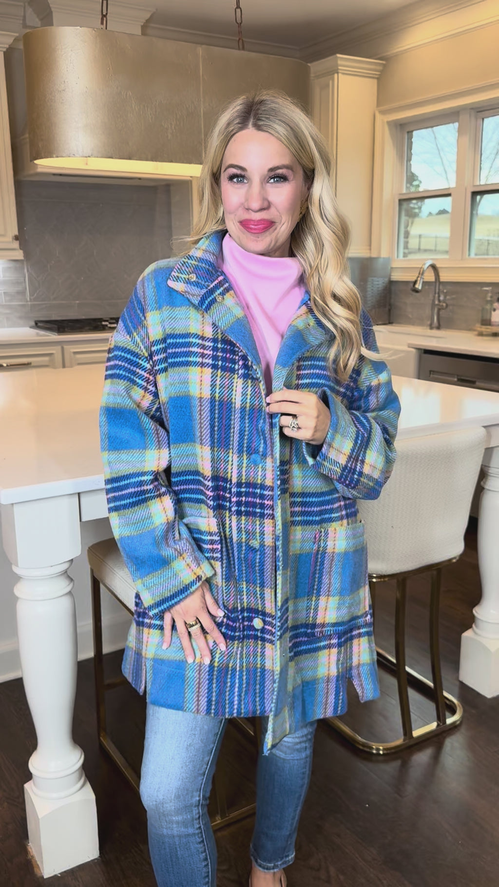 Meet your new statement layer. This ultra-soft, medium-weight jacket features a gorgeous mix of blues, yellows, and creams in a bold oversized plaid that instantly elevates any outfit. Designed with a relaxed, slightly oversized silhouette, deep front pockets, and snap-button closure, it’s the perfect blend of cozy, chic, and effortless.