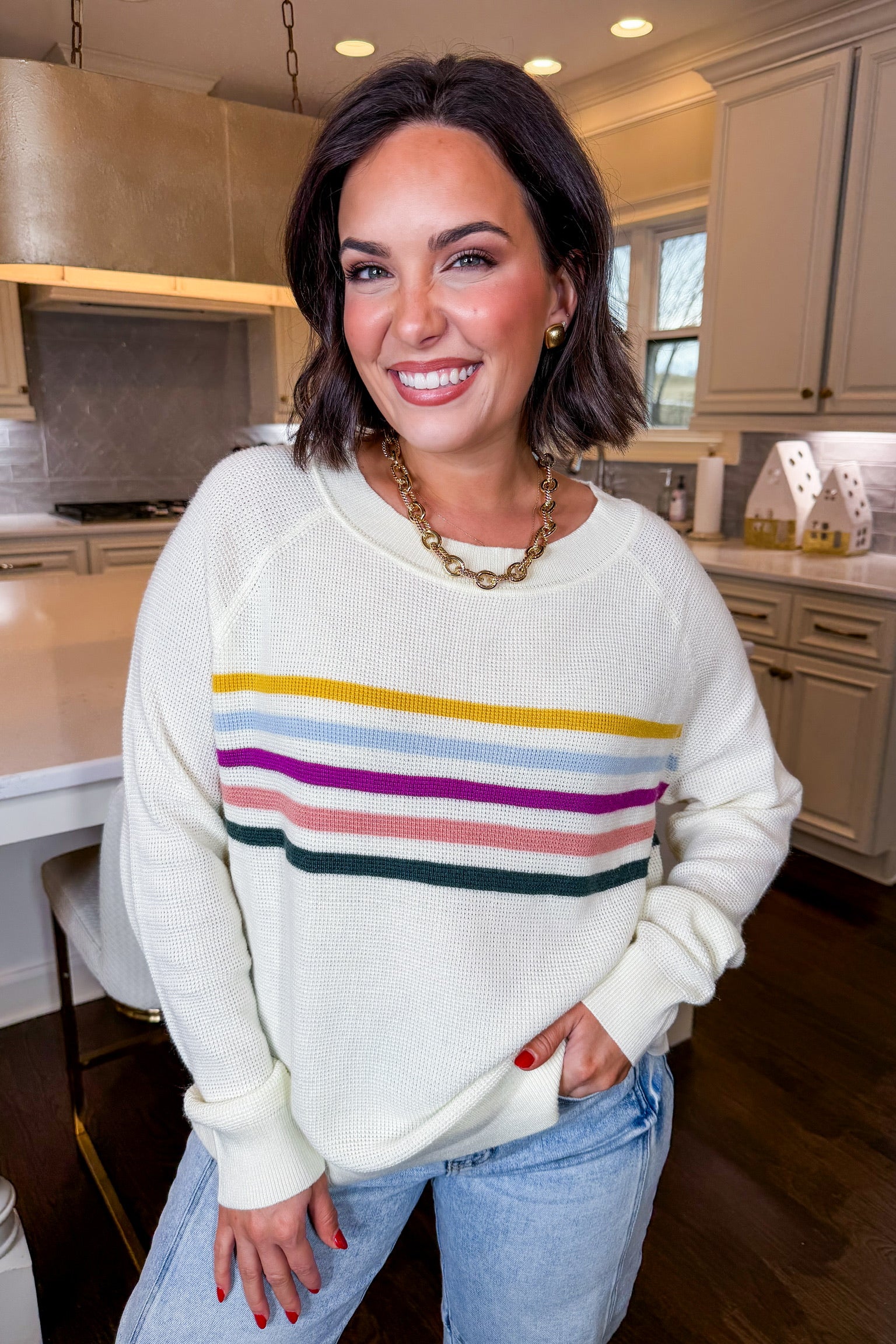 Brighten up your everyday look with this effortless striped knit. Designed in a lightweight, breathable sweater fabric, this top features a relaxed fit with colorful horizontal stripes that add the perfect pop without overwhelming your outfit. Easy to dress up or down, it’s the kind of throw-on piece you’ll reach for season after season.