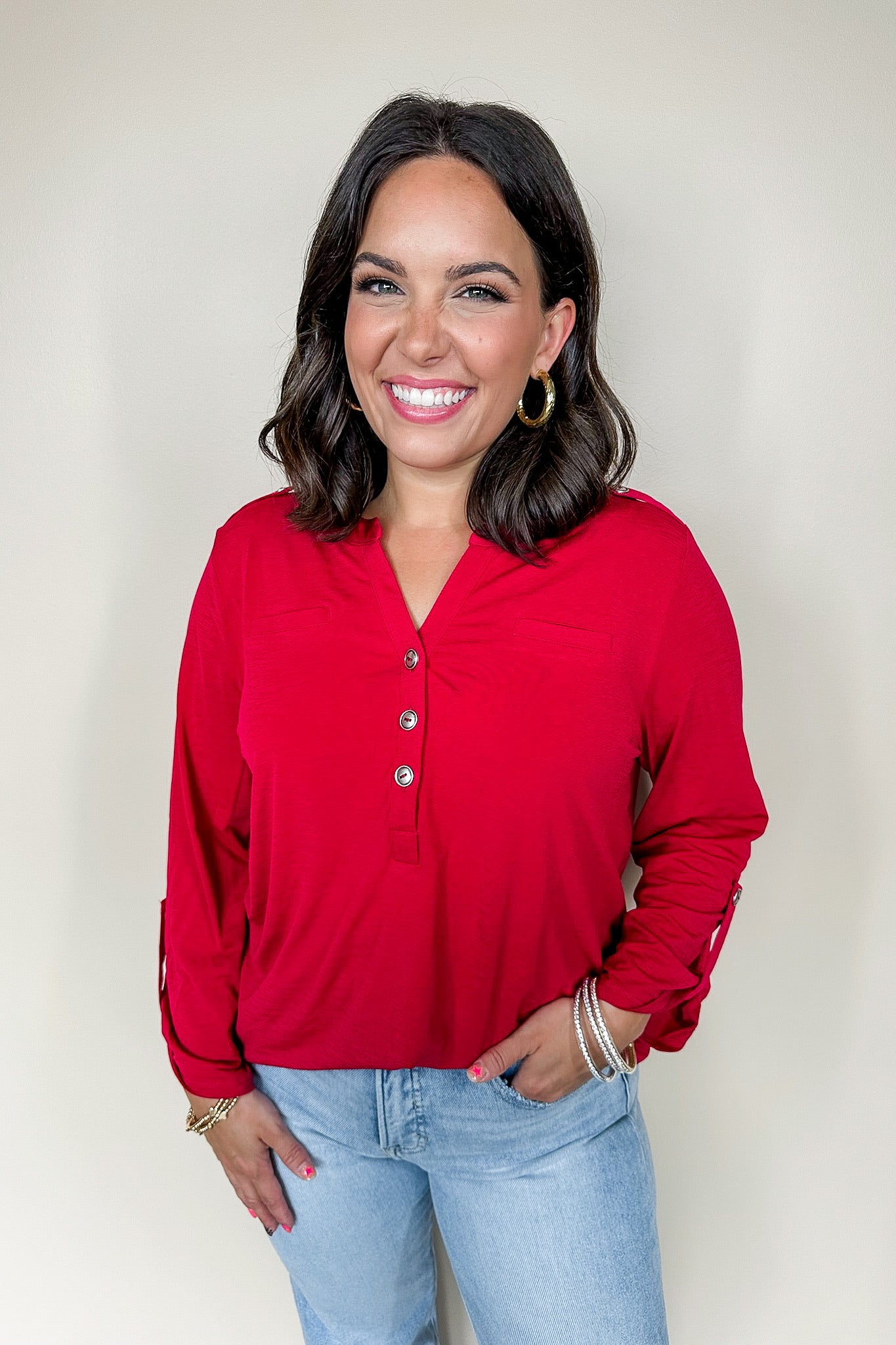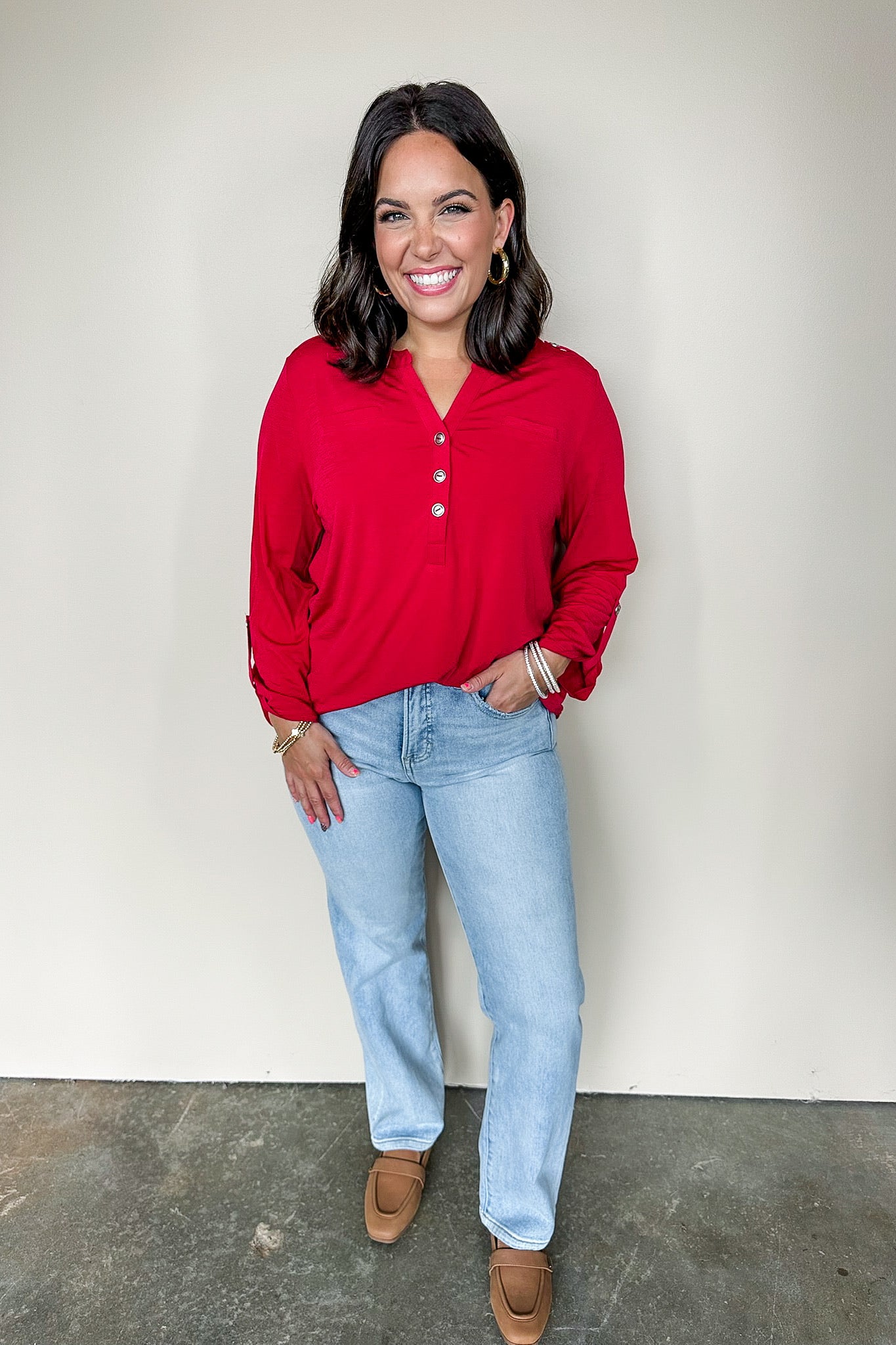 Brighten your wardrobe with the Dear Scarlett Lizzy Top In Solid Jewel Red. This best-selling floral print features a flattering V-neck and breezy 3/4 length sleeves, perfect for effortless style with a playful twist. Its vibrant design and comfortable fit make it an easy go-to for any casual outing or lively gathering.