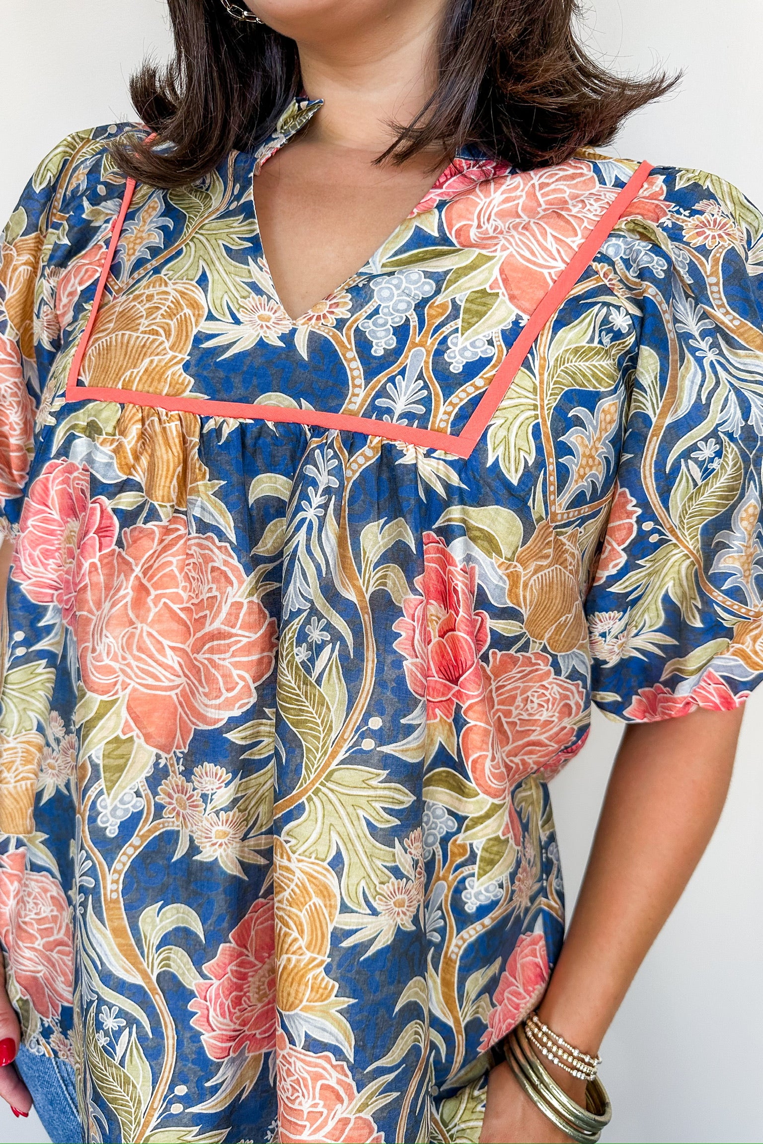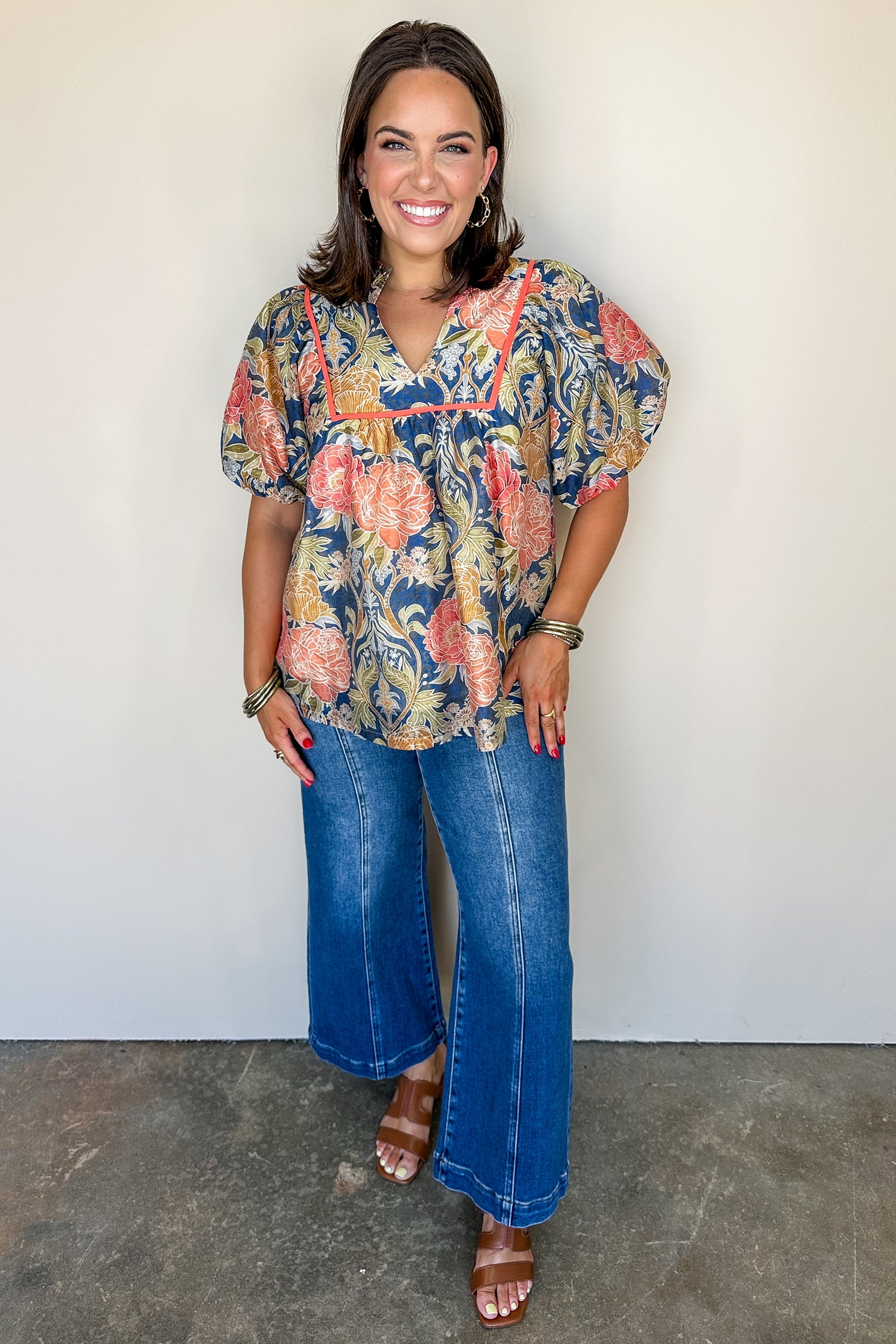 This navy floral printed blouse features a flattering V-neckline and elegant puff sleeves, adding a touch of sophistication to your outfit. Designed to hit at the waist, it offers a tailored fit that enhances your silhouette, making it perfect for both workdays and special occasions.