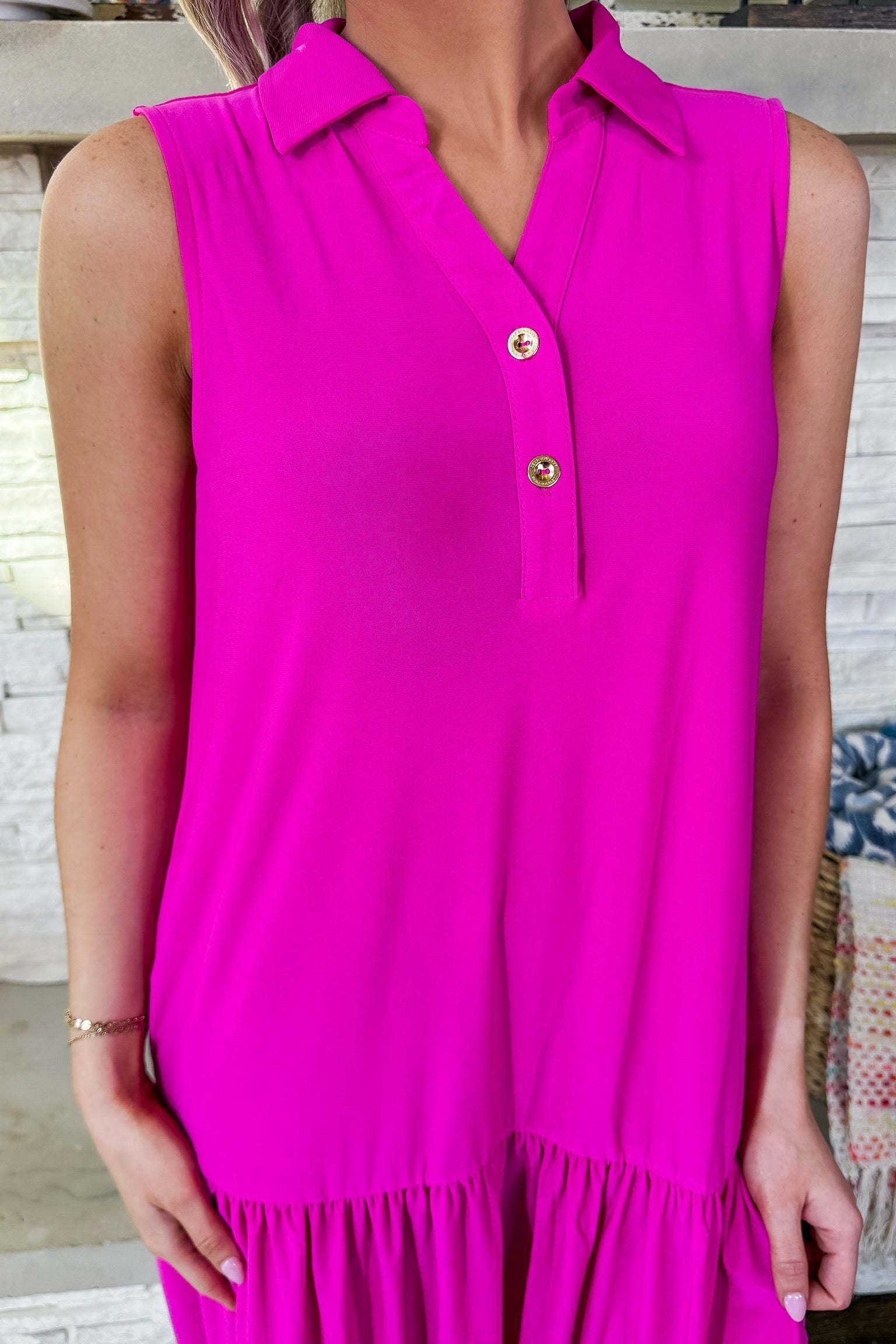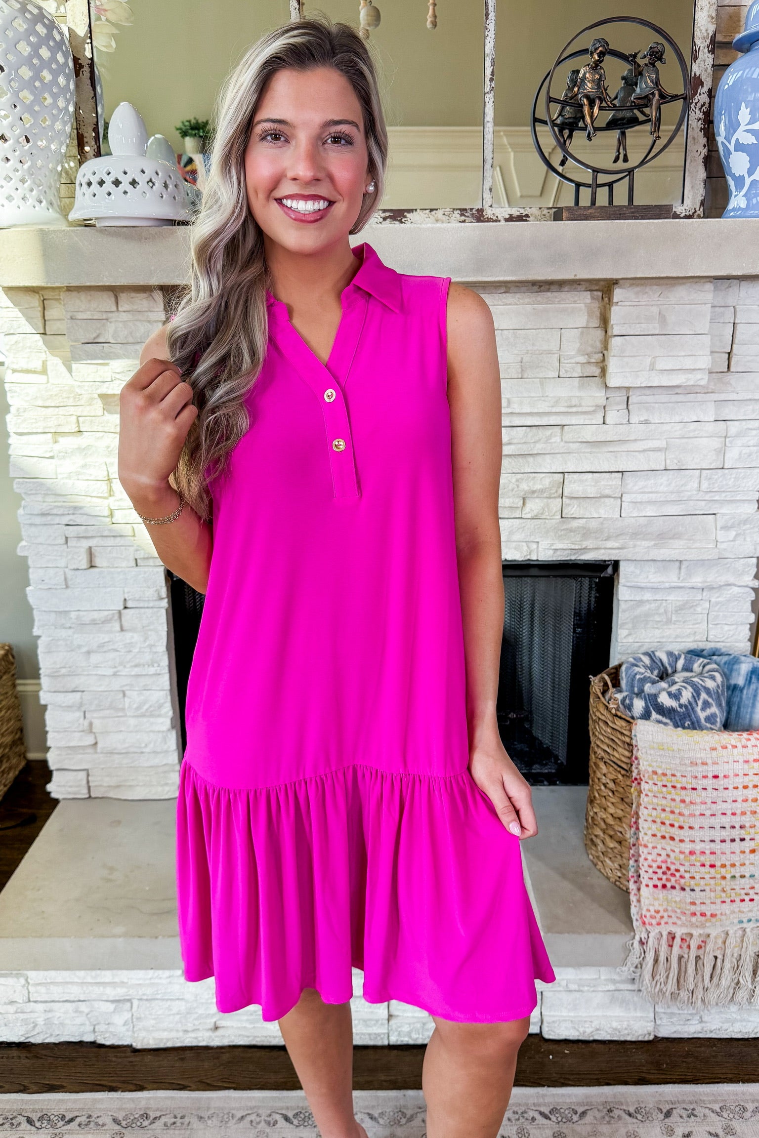 The Coral Sands Swing Dress is an effortless blend of comfort and charm. Designed with a relaxed swing silhouette, this dress features a flattering notch neckline with a collar and a henley-style button front for a polished touch. The drop waist with a ruffle hem adds easy movement and feminine detail, while the lightweight, non-wrinkle fabric makes it a true throw-on-and-go favorite for busy days, travel, or warm-weather outings.