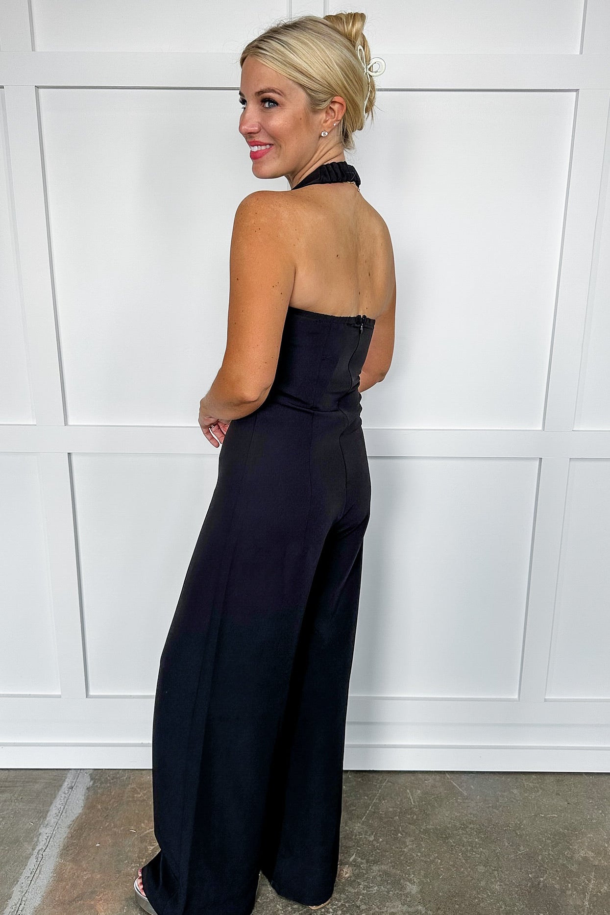 This elegant black halter jumpsuit features a floor-length silhouette with a fitted waist that accentuates your figure. Designed to fit true to size, it offers a refined and flattering look perfect for sophisticated occasions.