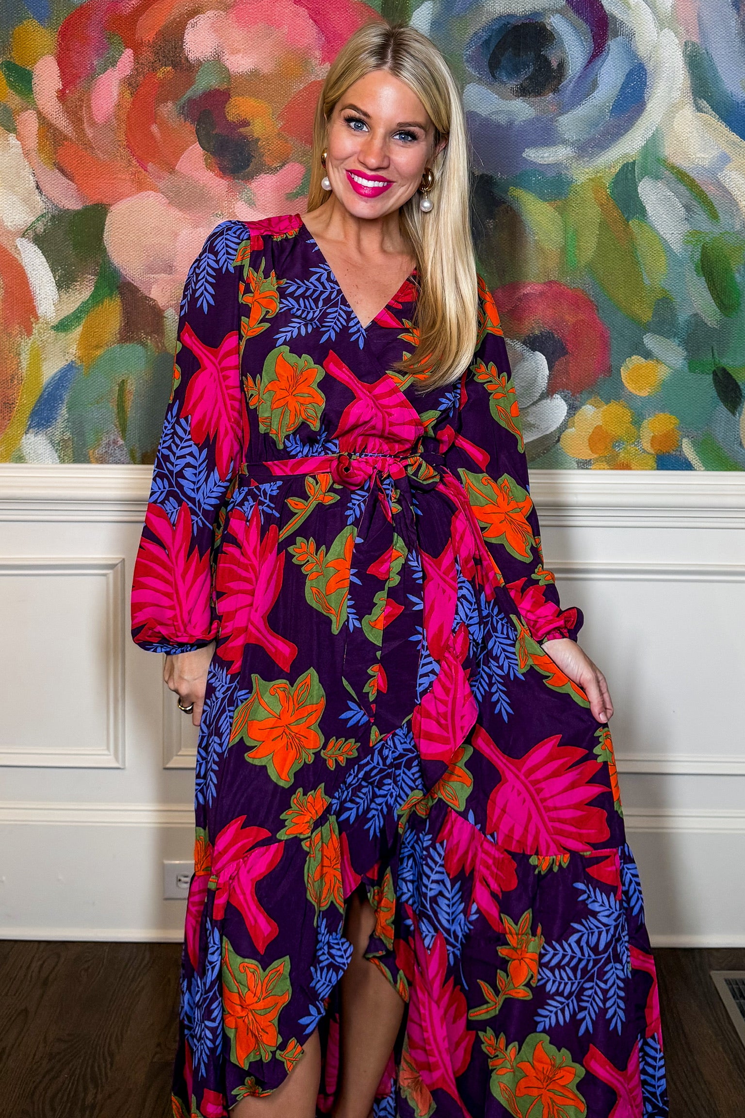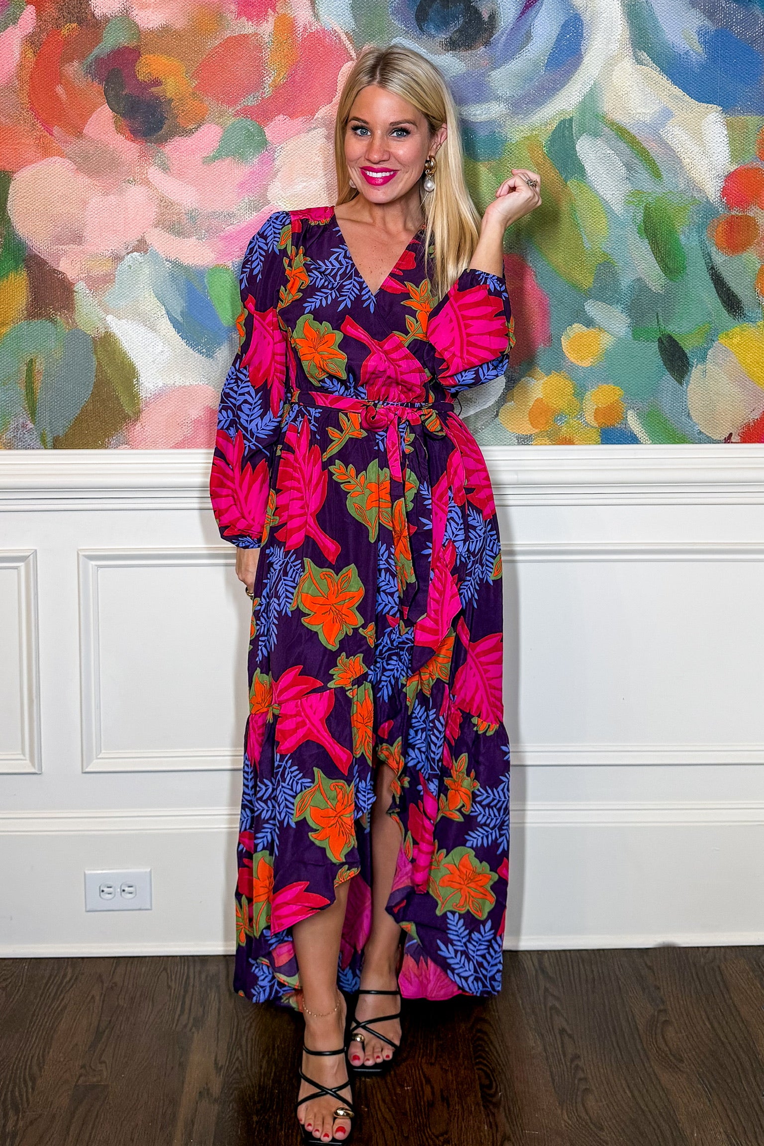 Step into your statement era with our Mirage Maxi Dress. This stunning full-length piece features an abstract floral print bursting with rich jewel tones—deep reds, violets, and electric blues that make every moment feel like magic. With a flattering V-neckline, a comfortable elastic waist, and a front slit for effortless movement, this dress blends elegance with bold personality. Whether you’re headed to a fall wedding, a holiday party, or just want to stand out, this maxi is your new go-to showstopper.