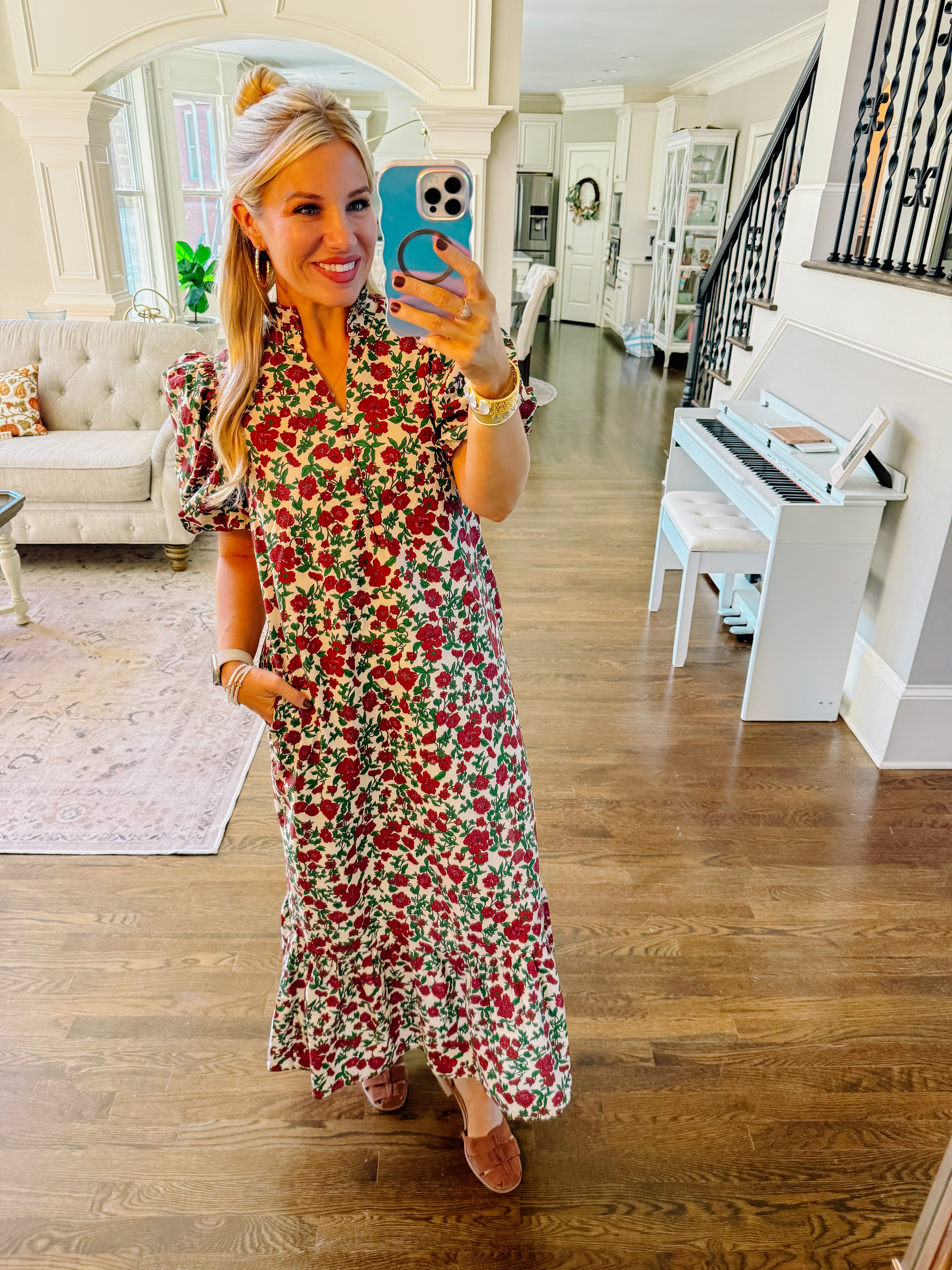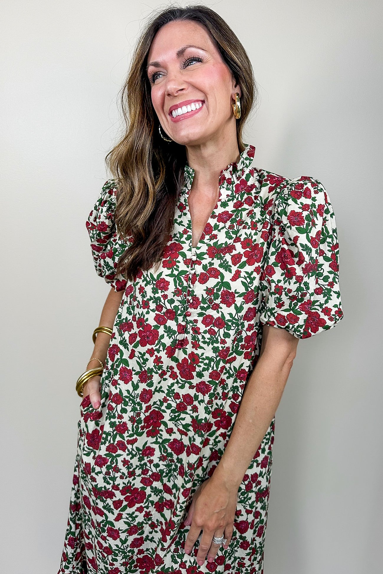 Step into springtime charm with the J&J Best Selling Floral Rose Dress. This playful maxi dress features a flattering silhouette, puff sleeves, and a flirty V-neck with ruffle detail. Plus, handy pockets add a touch of practical fun to your floral look. Perfect for twirling through sunny days or casual evenings out!
